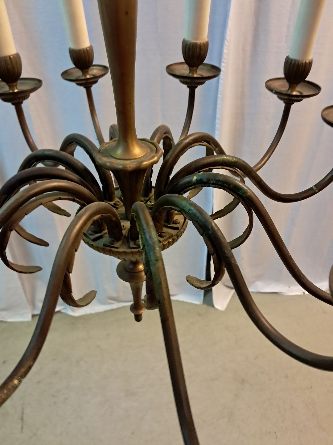 12-armet lysekrone i messing, fra 1950erne.Den har brugsspor.