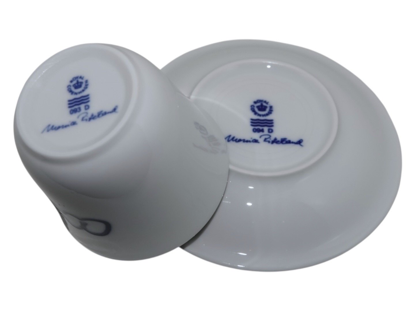 Royal Copenhagen Musica, højhankskop med tilhørende underkop. Dekoration D.Dekorationsnummer 093D (kop) og 094D (underkop).