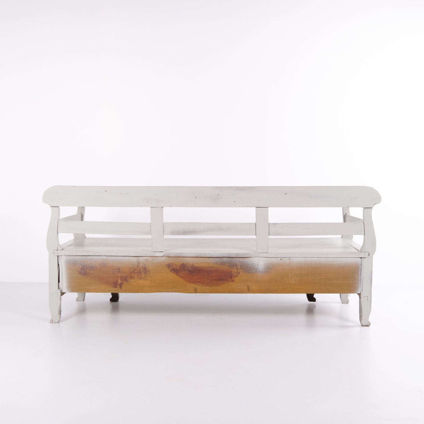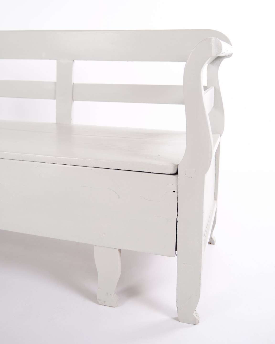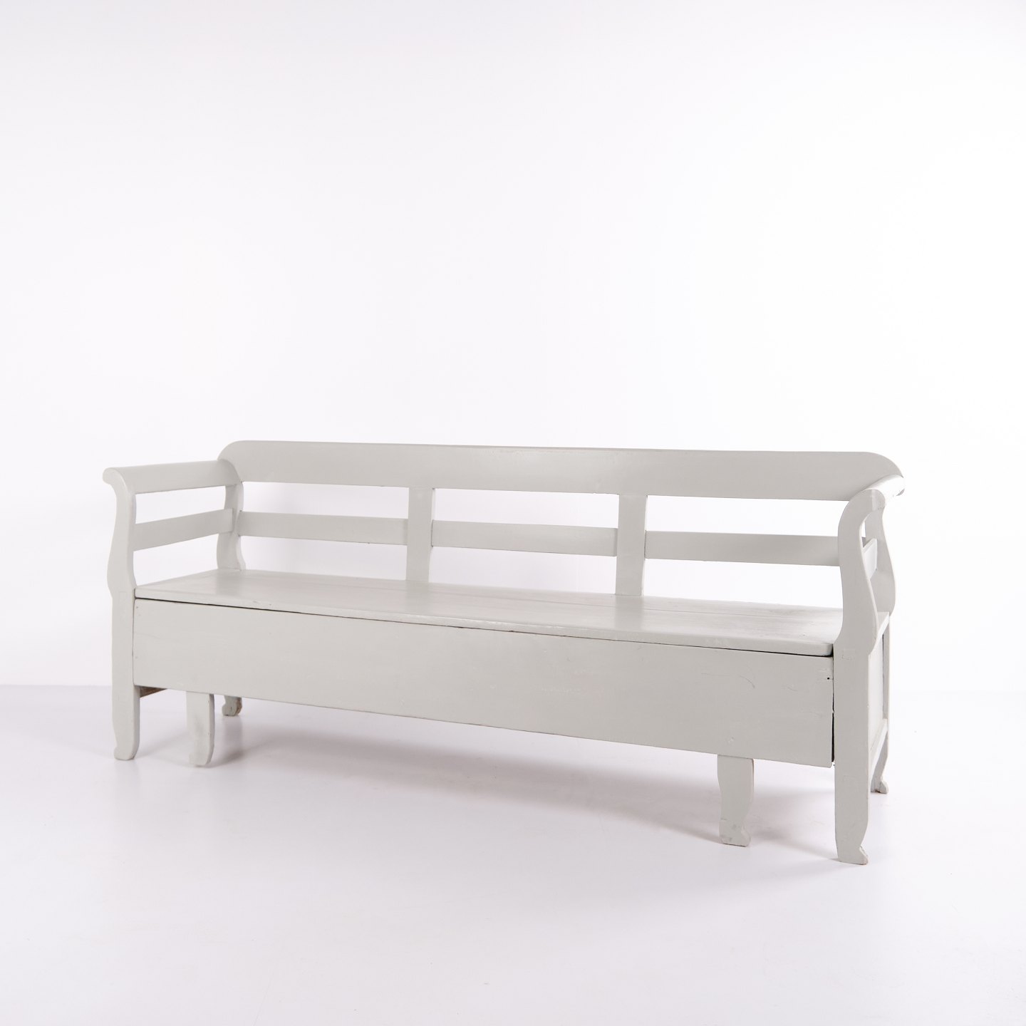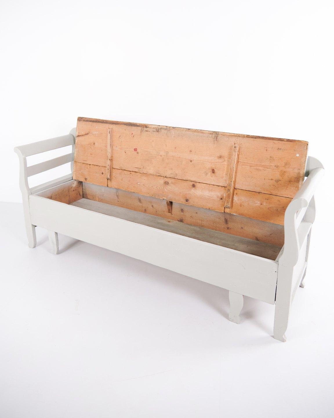 Antike Truhenbank aus den 1860er-Jahren aus grau gestrichenem Kiefernholz mit Stauraum. Klassisches und funktionales Möbelstück mit Patina.— Zeitraum: 1860er-Jahre