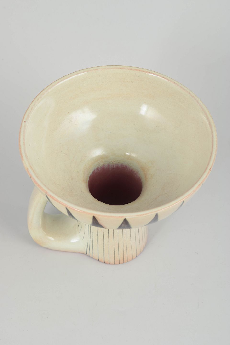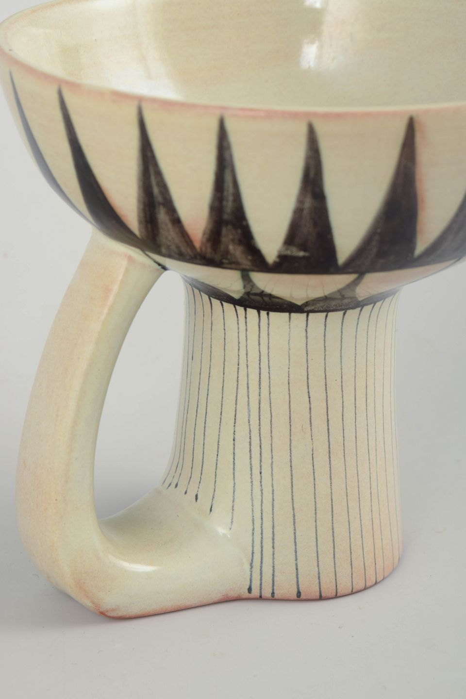 Skulpturelt formet vase i stentøj med markant fod og sidehank. Dekoreret med indridset, lodret linjeføring og kontrasterende sort, grafisk bånddekoration langs kummeranden. Glasuren har en blød, lys tone med tydelig håndværksmæssig karakter, typisk for Stålhane’s produktion hos Rörstrand i 1960’erne.
