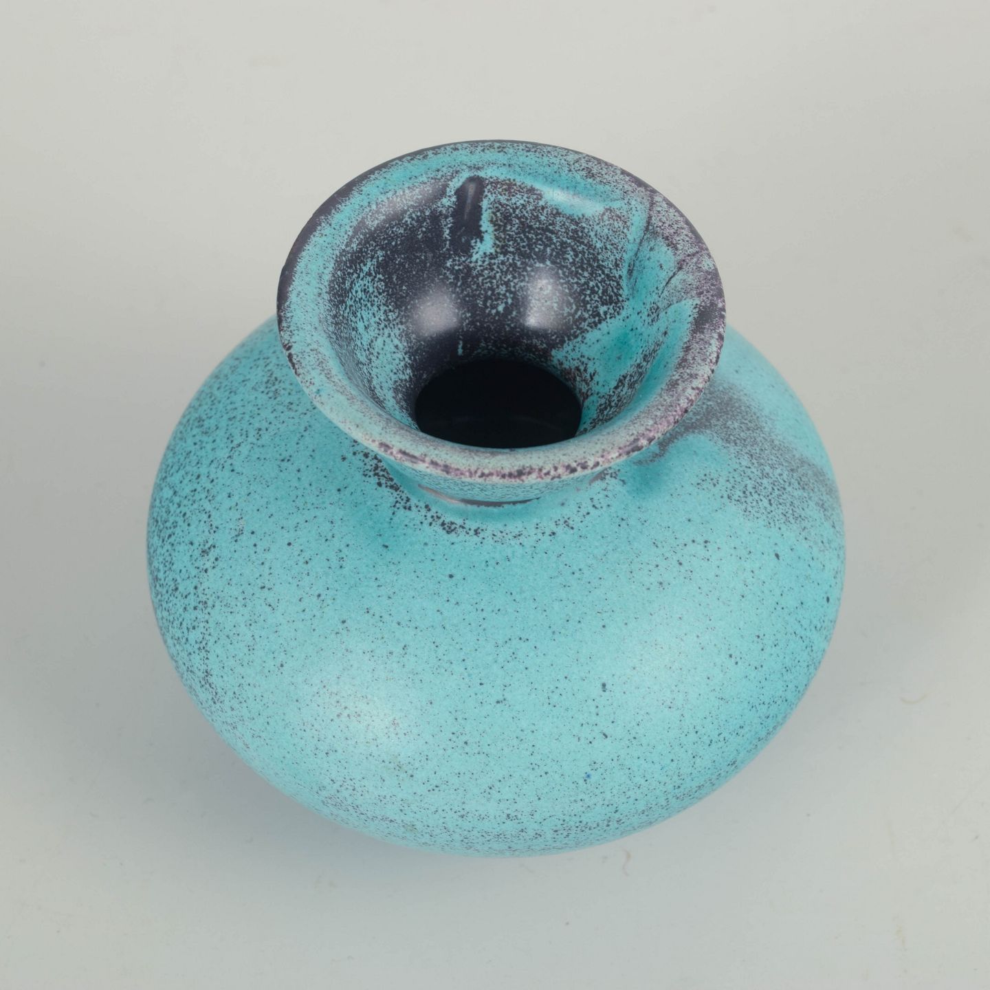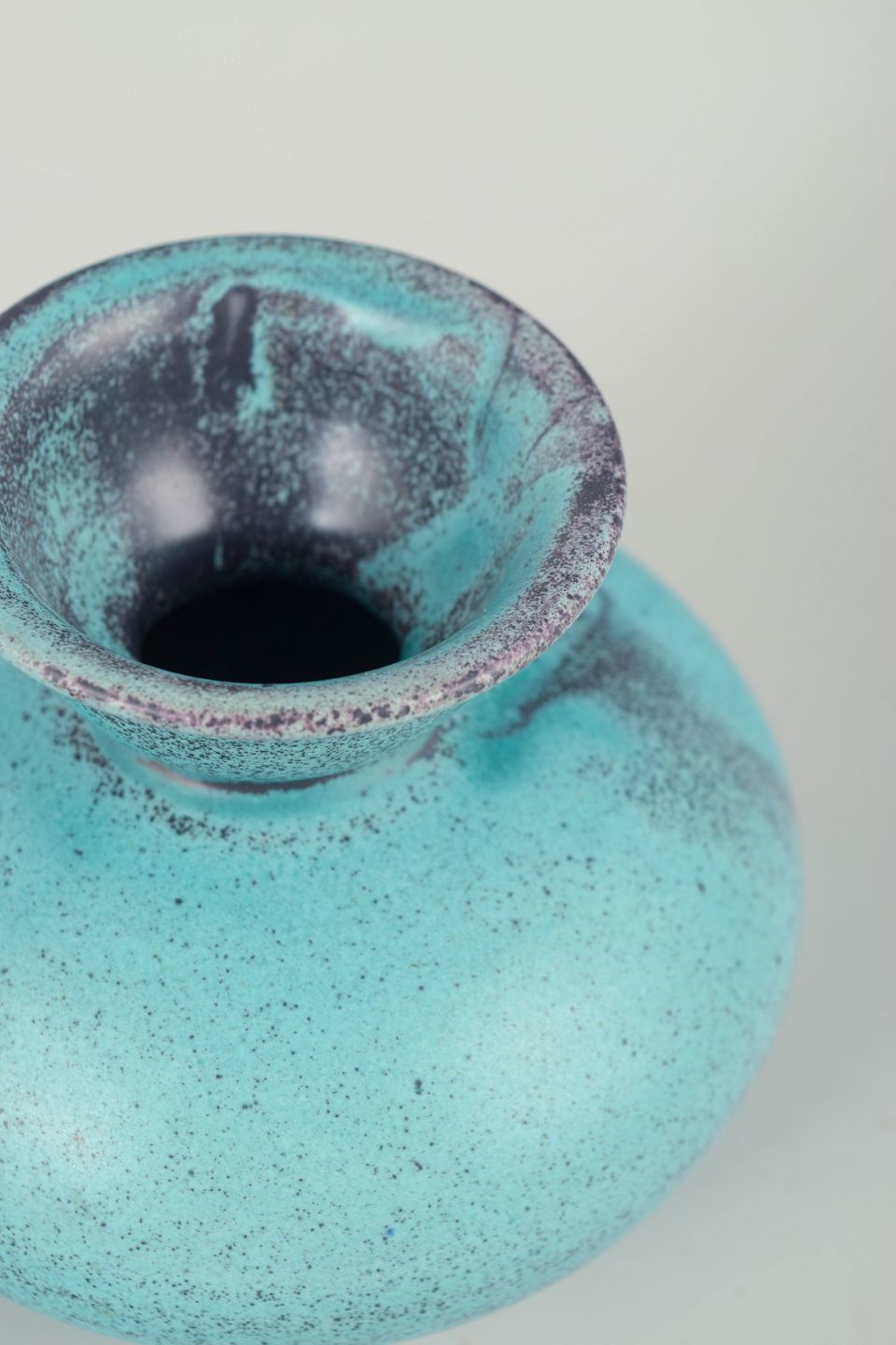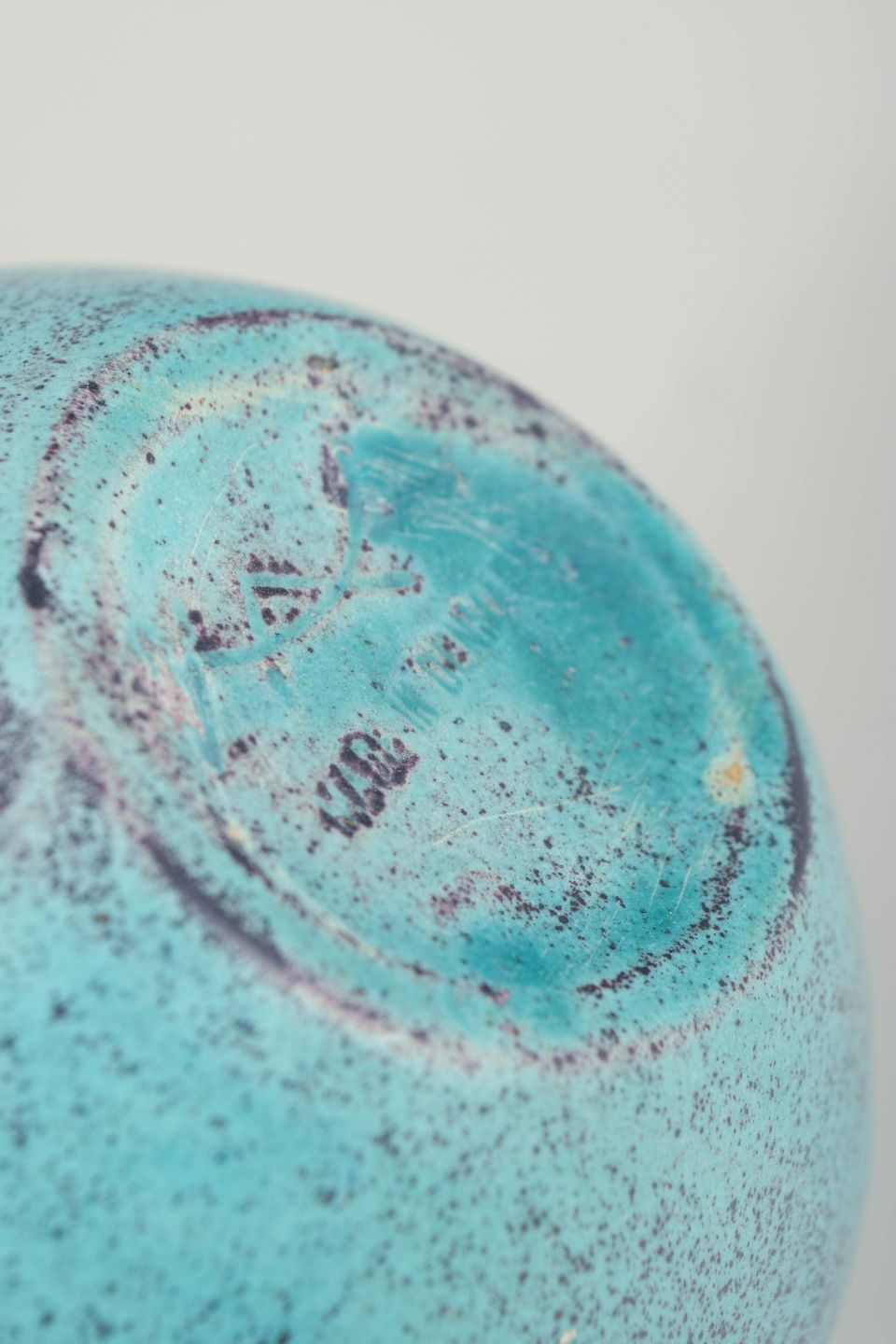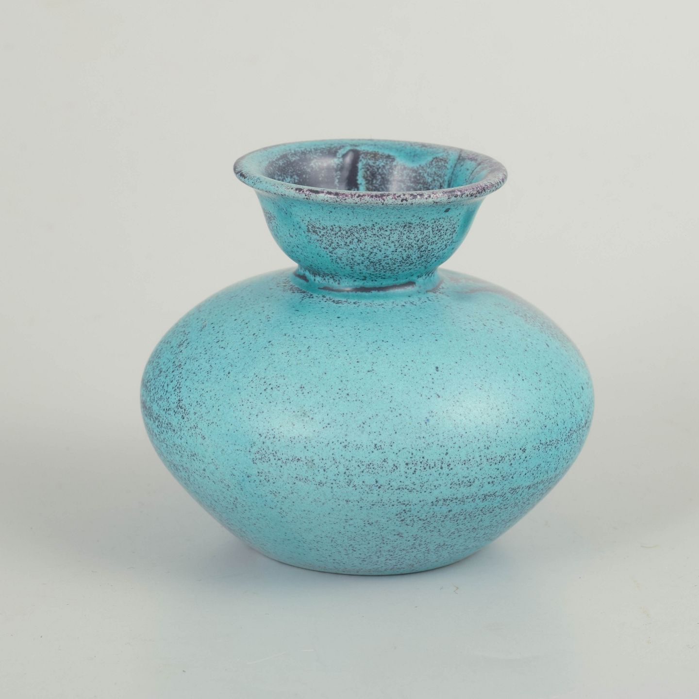 Kompakt, balusterformet vase i stentøj med smal, let udadbøjet hals. Udført i en klar turkisblå glasur med fint, levende spil og diskrete mørkere nuanceringer omkring mundingen. Formen er rolig og velafbalanceret og afspejler Svend Hammershøis karakteristiske fokus på proportion, volumen og glasurens stoflighed.