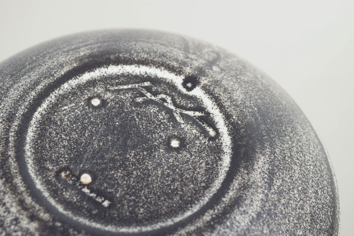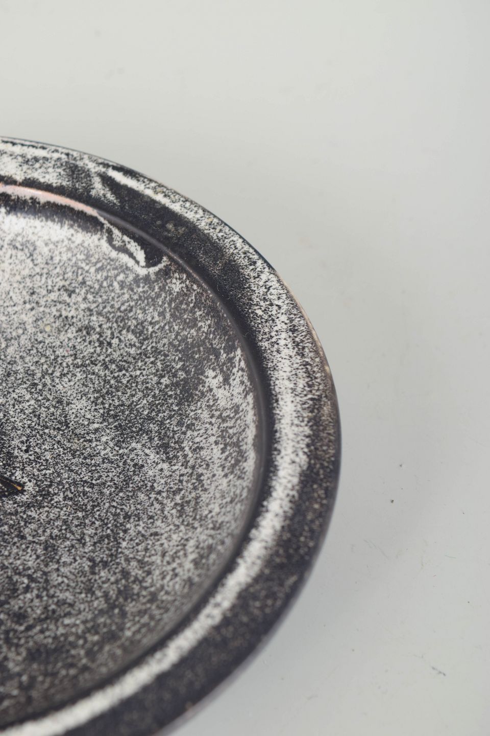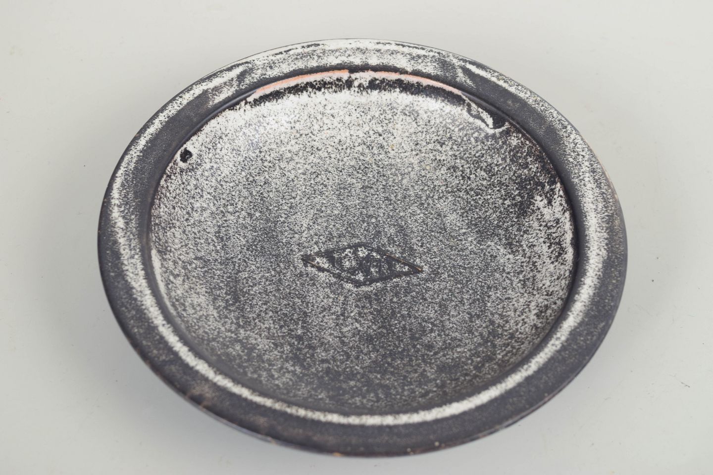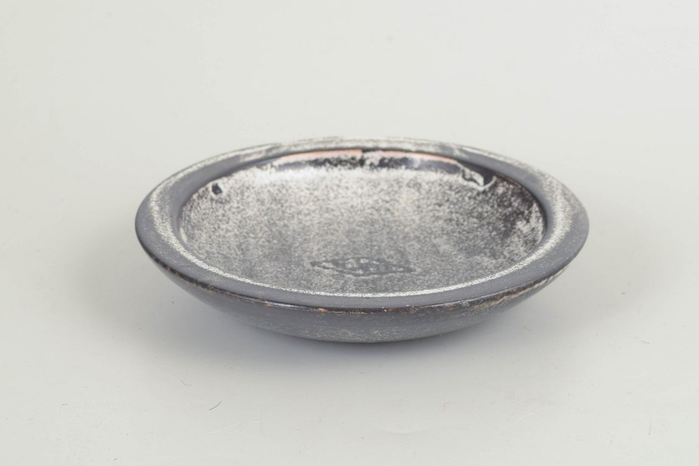 Lav, rund skål i stentøj med kraftig, afrundet kant og karakteristisk dobbeltglasur i grå og sort. Den levende, let metalliske overflade og den enkle, balancerede form er typisk for Svend Hammershøis arbejder for Kähler i mellemkrigstiden, hvor materialets stoflighed og glasurens dybde spiller en central rolle.