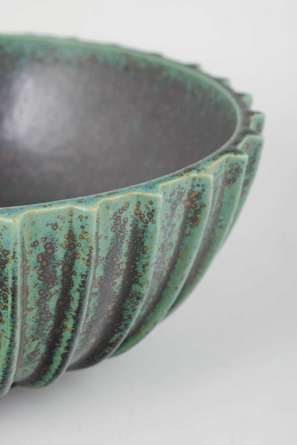 Kraftfuldt formet Art Deco-skål i stentøj med markant lodret rifling og dyb, grøn løbende glasur over mørk bund. Formen er både monumental og balanceret, karakteristisk for Arne Bangs arbejder fra 1940’erne, hvor håndværk og skulpturel tyngde forenes.