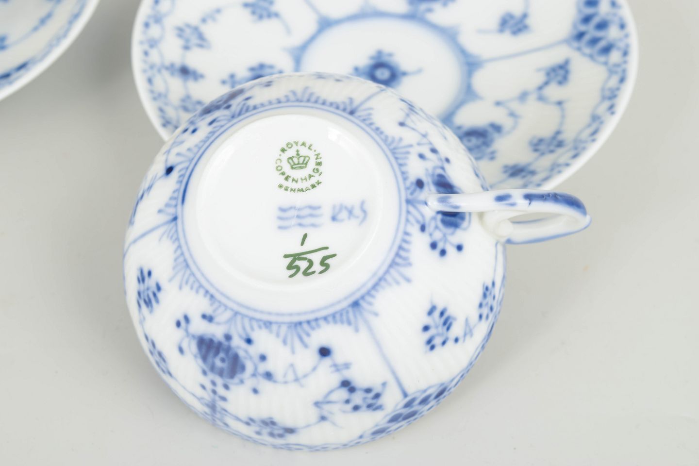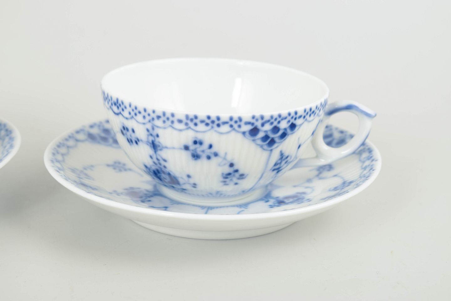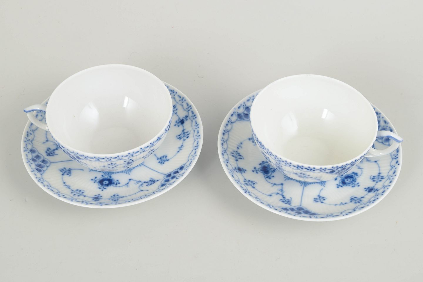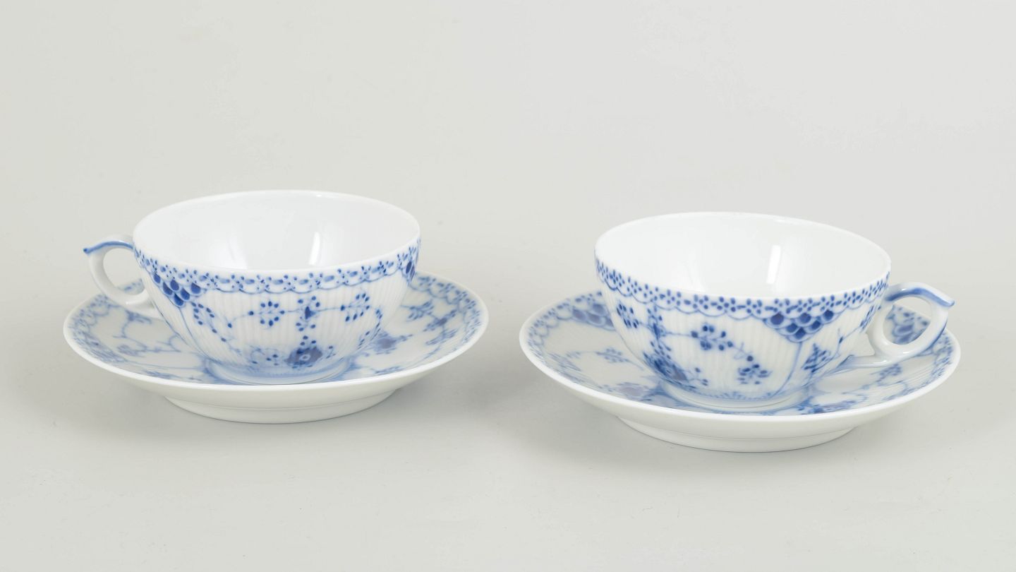 Sæt bestående af 2 tekopper med tilhørende underkopper i Musselmalet halvblonde. Klassiske riflede former med blondekant og håndmalet koboltblå dekoration. Et elegant og funktionelt tesæt fra sen produktion, velegnet til både brug og samling.