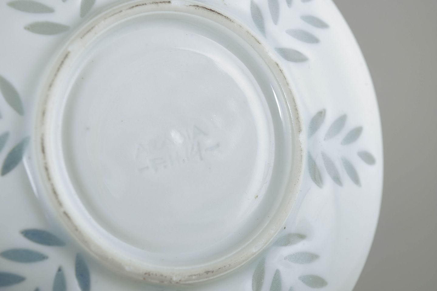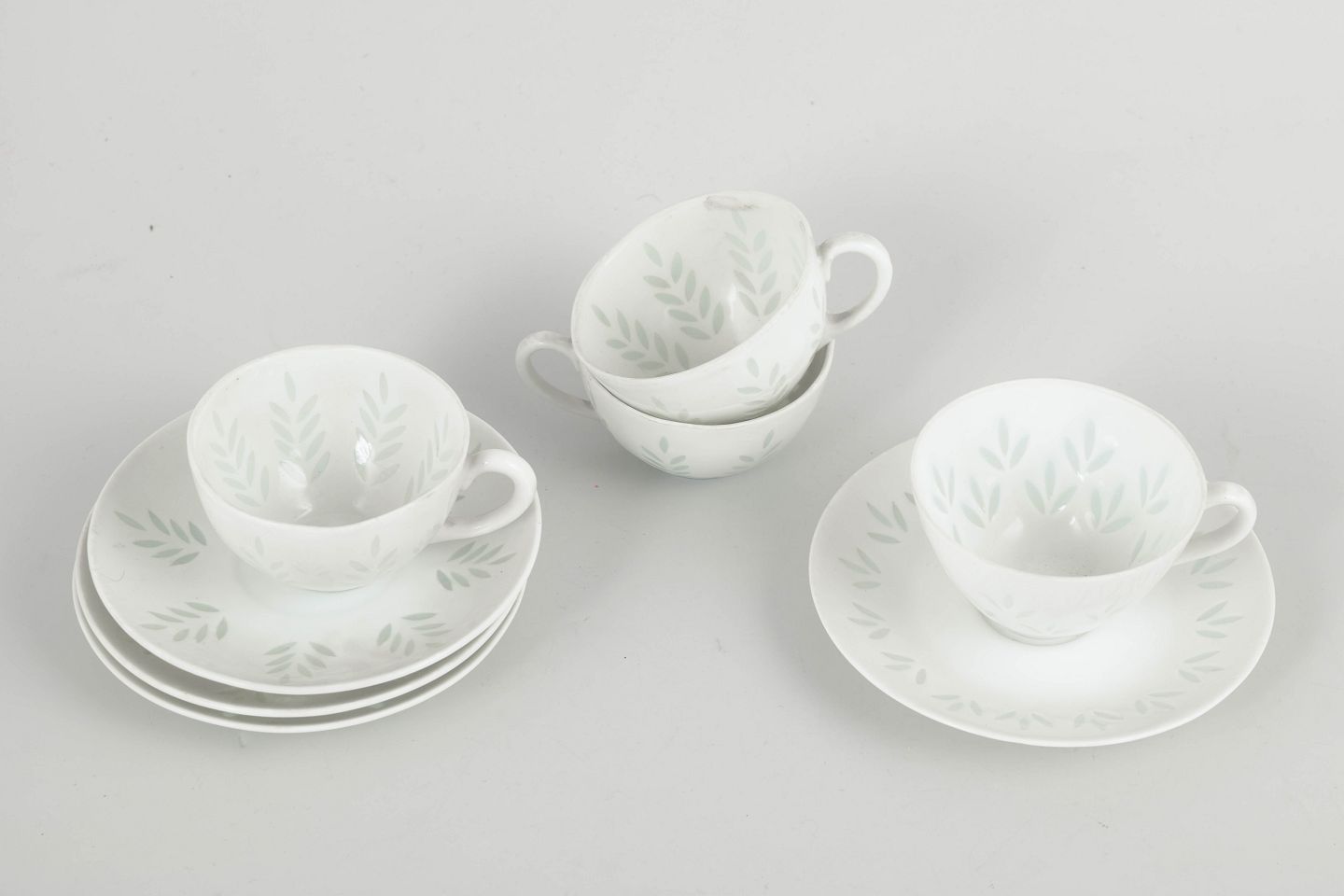 Elegant sæt bestående af fire mokkakopper med tilhørende underkopper i hvidt porcelæn, dekoreret med diskret bladornamentik udført i transparente, let grønligt tonede glasurfelter. Det lette og raffinerede udtryk kombineret med de bløde former er karakteristisk for Friedl Holzer-Kjellbergs sene porcelænsproduktion for Arabia.