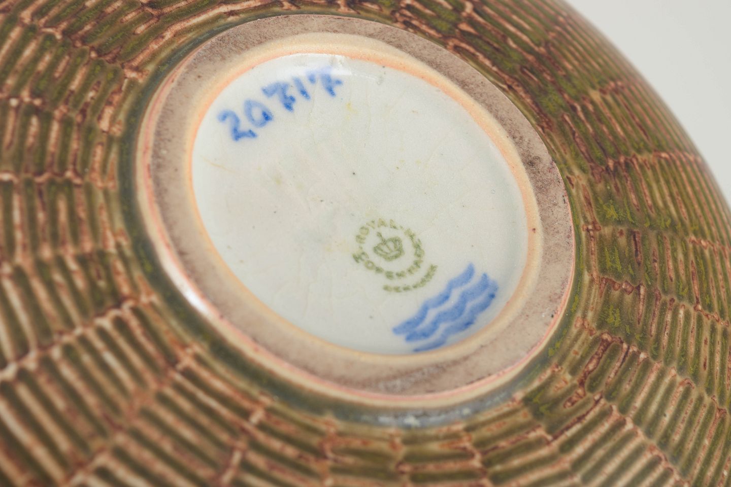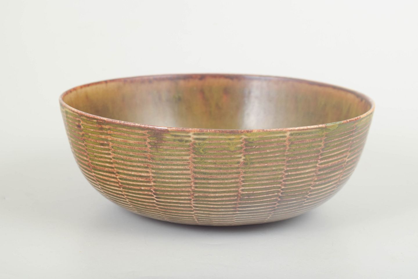 Lav, bred stentøjsskål med riflet overflade i et regelmæssigt horisontalt relief, karakteristisk for Axel Saltos geometrisk-organiske formsprog. Den riflede stil er én af Saltos tre karakteristiske stilarter. Glaseret i afdæmpede jordfarver med fine nuancer af grøn, brun og gyldne toner, som fremhæver reliefstrukturen og giver skålen et levende, stofligt udtryk.