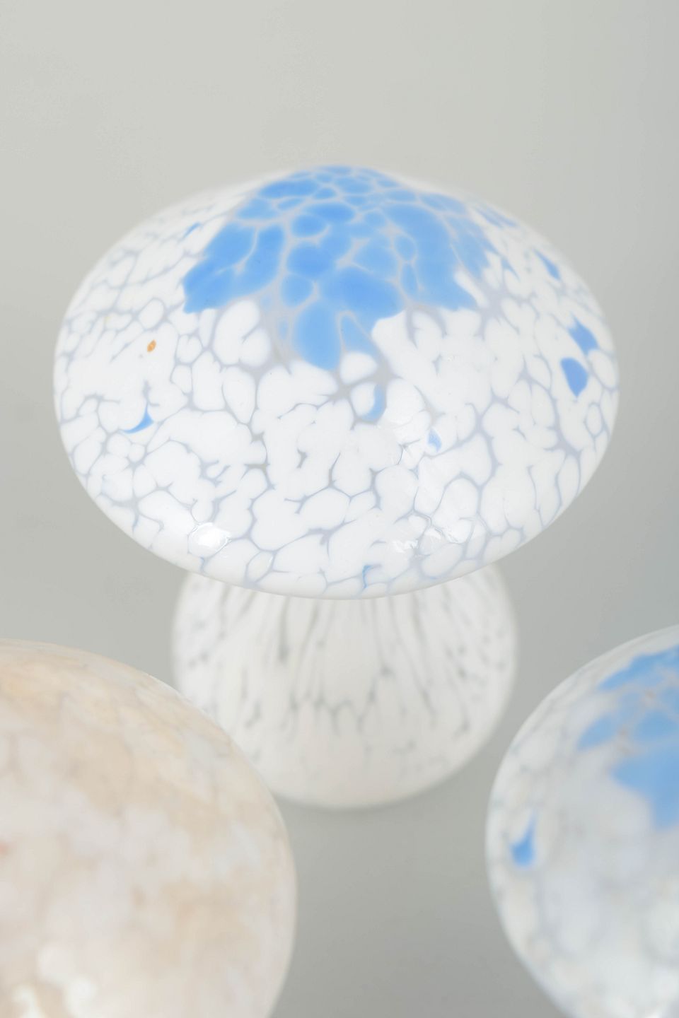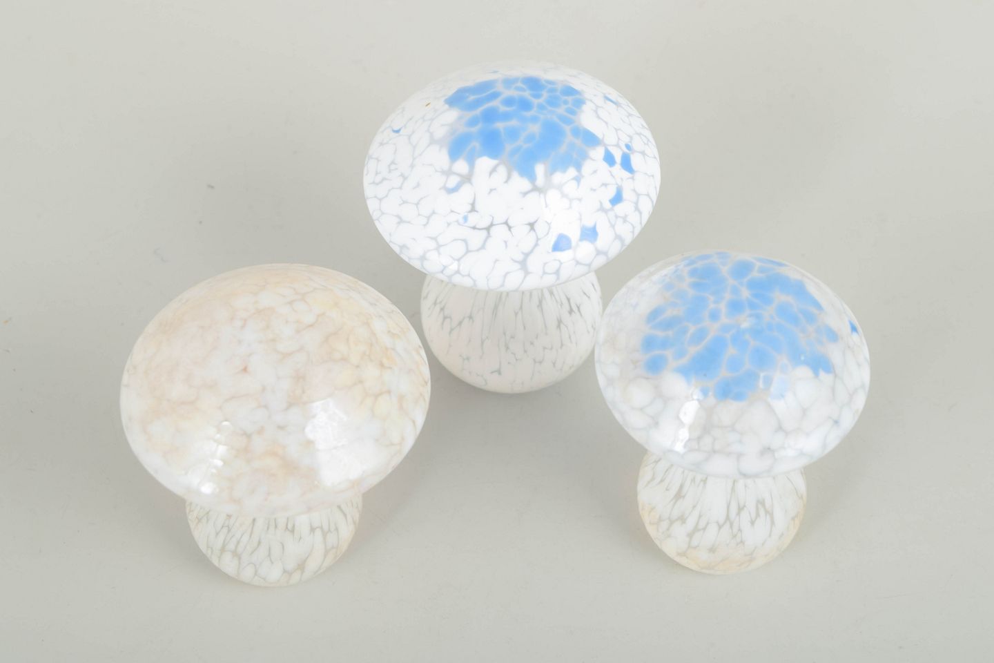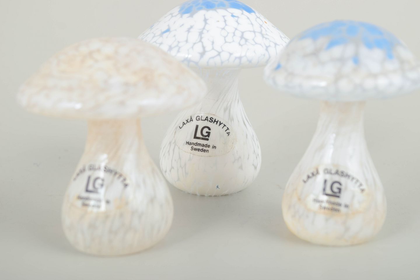 Sæt med tre dekorative svampe i formblæst kunstglas med krakeleret, let opaliserende struktur og blå/hvide nuancer. Alle eksemplarer med original mærkat fra Laxå Glashytta.