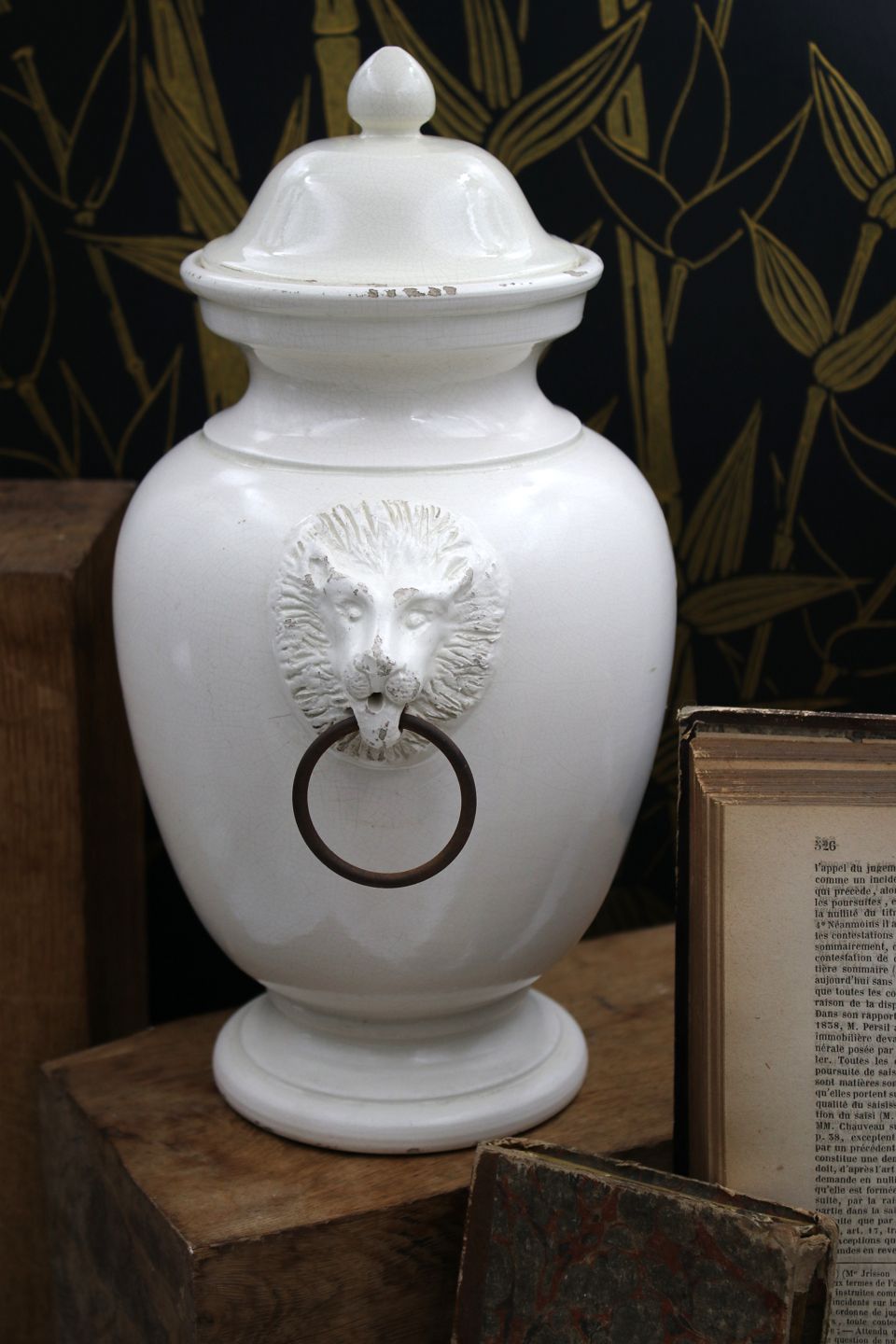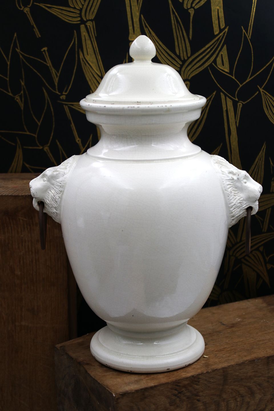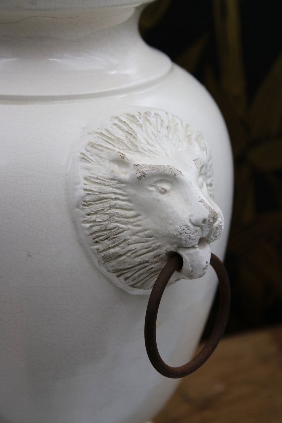 Gammel glaseret stentøjs lågkrukke med løvehoveder på siden...