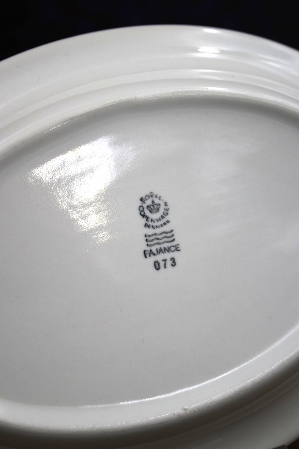 Gammelt oval Ursula fajance serverings fad / undertallerken fra Royal Copenhagen designet af Ursula Munch-Petersen med hvid glasur.Dekorationsnummer: 073. 1.sortering. 17,5x13cm.