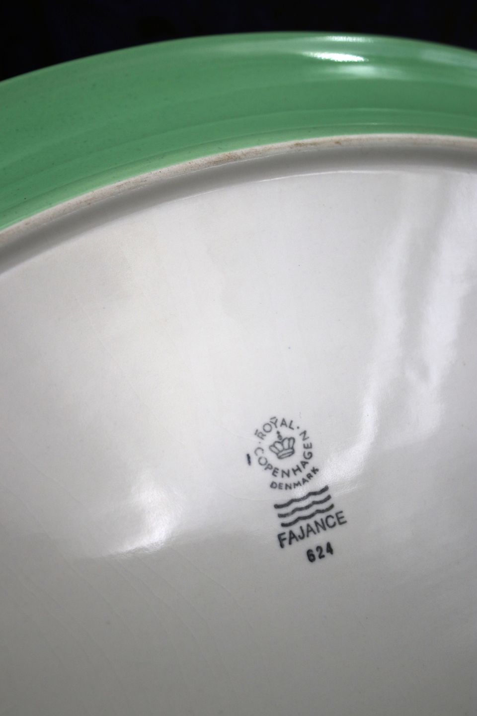 Gammelt oval Ursula fajance serverings fad / tallerken fra Royal Copenhagen designet af Ursula Munch-Petersen med grøn glasur.Dekorationsnummer: 624. 1.sortering. 33x22.5cm.