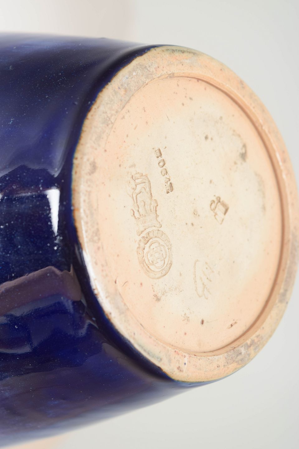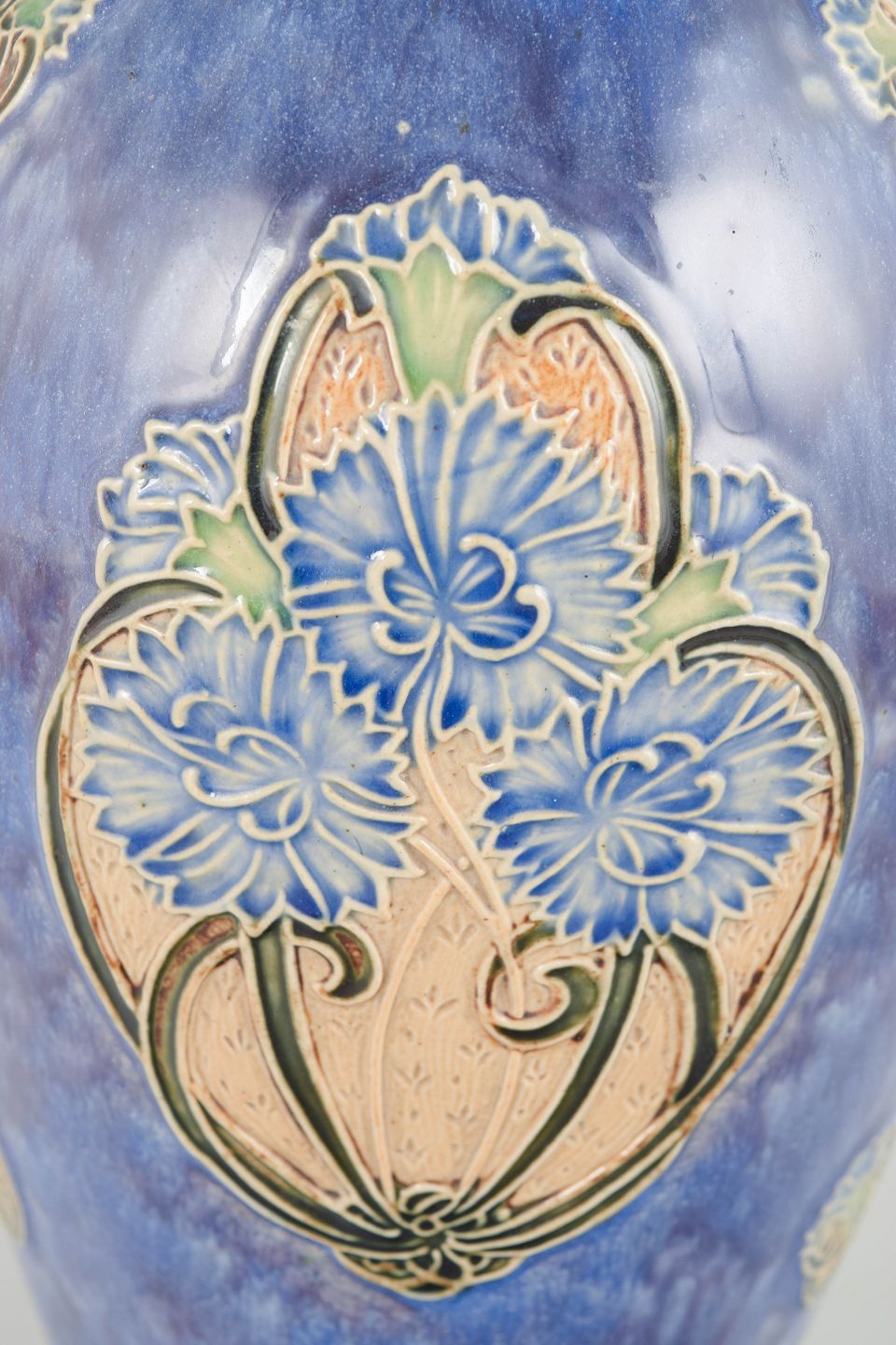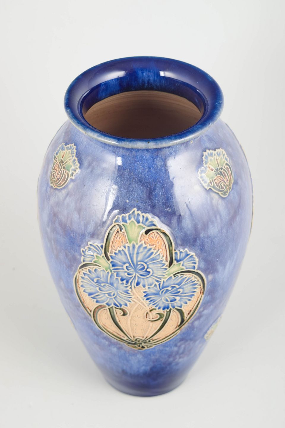 Royal Doulton Art Nouveau vase, 1930’erne.Elegant Art Nouveau-vase udført i glaseret stentøj med dyb blå løbende glasur og reliefdekorerede blomsterfelter i lyse og varme nuancer. Vasen har en harmonisk balusterform med let udadbøjet munding og fremstår som et klassisk eksempel på Royal Doultons dekorative produktion i mellemkrigstiden.