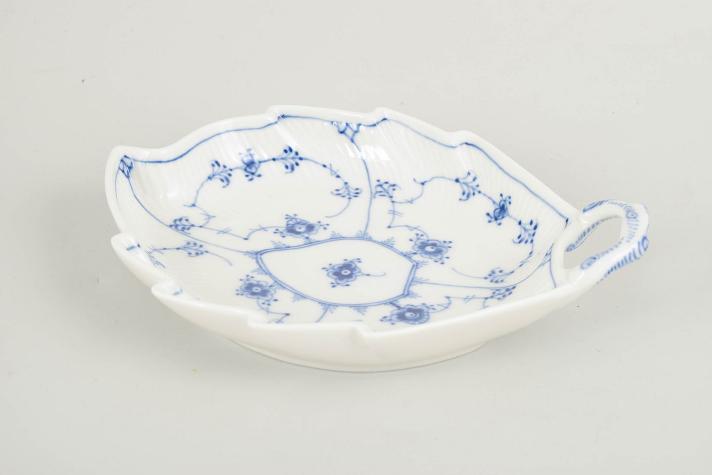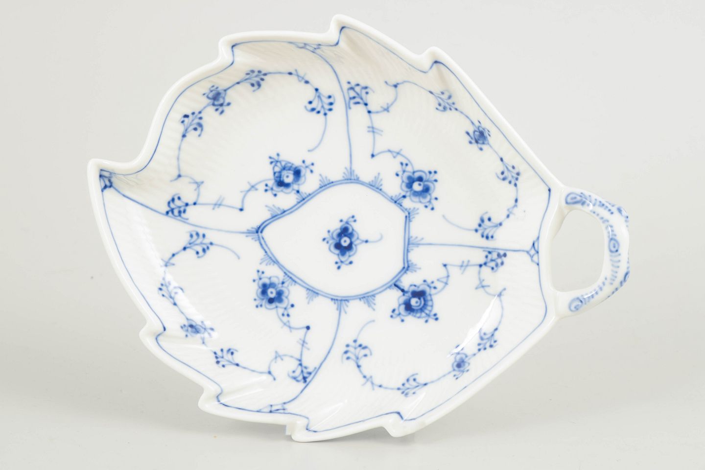 Royal Copenhagen Musselmalet Riflet fad med hank, 1966.Dekorativt fad i Musselmalet Riflet, udført i bladformet model med integreret hank og let bølget rand. Fadet er dekoreret med håndmalet koboltblå underglasur i det klassiske musselmalede mønster og kombinerer en skulpturel form med praktisk anvendelse. En karakterfuld og relativt sjælden serveringsdel i stellet.