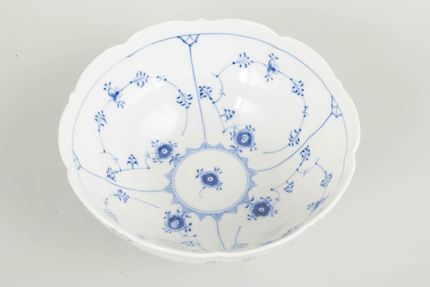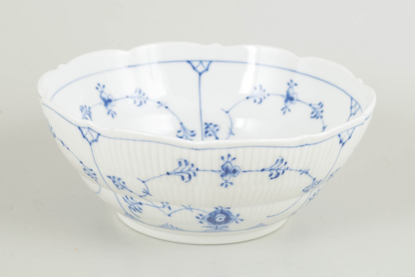 Royal Copenhagen Musselmalet Riflet skål, 1963.Sjælden skål i Musselmalet Riflet, udført i klassisk riflet form og dekoreret med håndmalet koboltblå underglasur. Skålen har en let bølget rand og fremstår som en mindre almindelig model inden for stellet, velegnet både til servering og som dekorativ del på bordet.