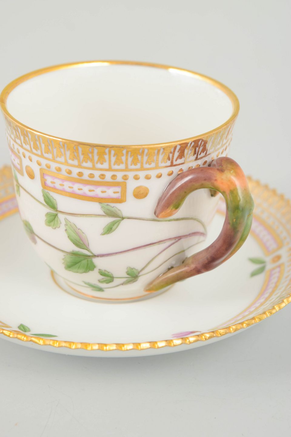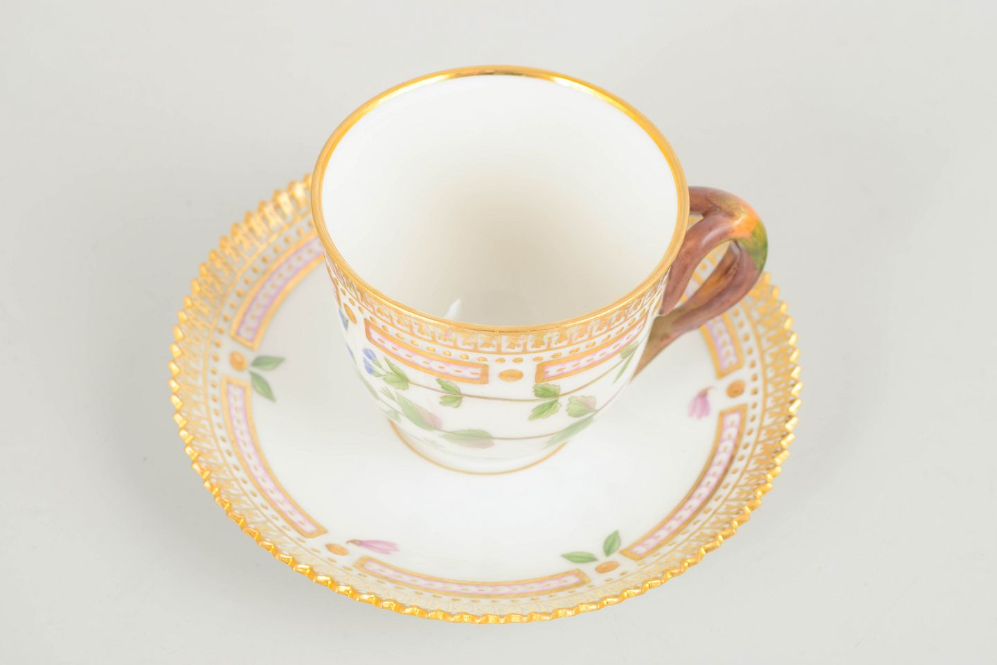 Bio: Flora Danica-stellet blev introduceret i 1790 og regnes blandt Royal Copenhagens mest prestigefyldte produktioner. Dekorationerne er baseret på det monumentale botaniske værk Flora Danica og er kendetegnet ved høj detaljerigdom og fremragende håndværksmæssig kvalitet. moccakopper var traditionelt anvendt til servering af stærk kaffe og repræsenterer en raffineret del af det klassiske kaffestel.