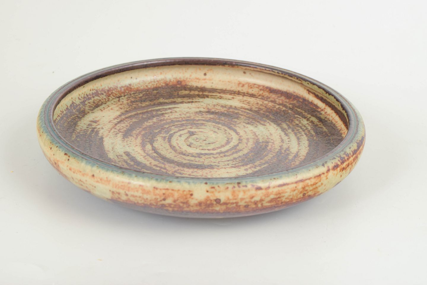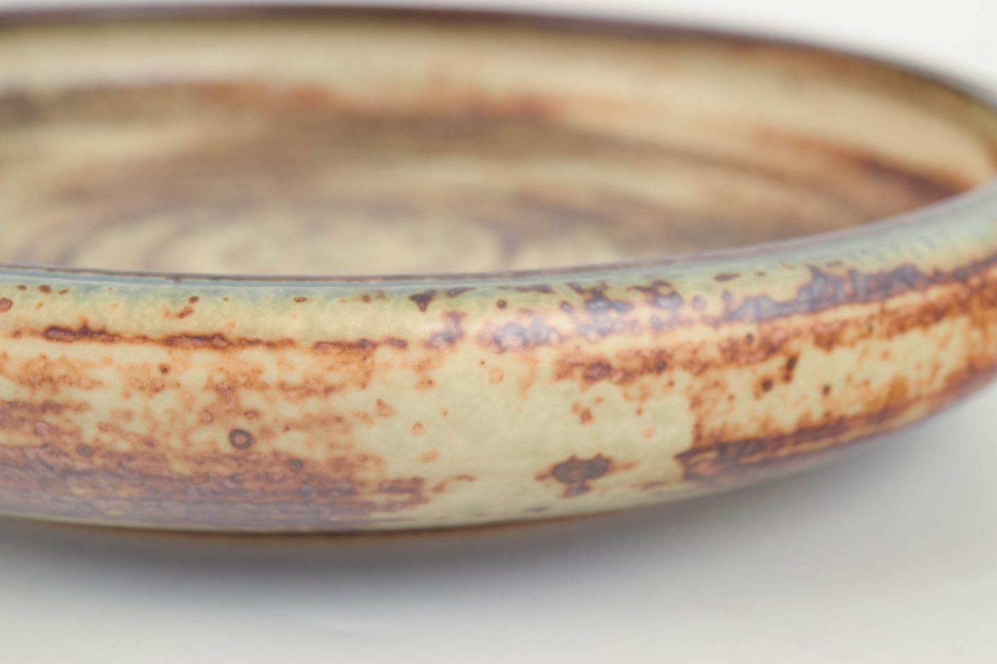 Carl Halier for Royal Copenhagen Skål / Fad.Stor, lav skål udført i stentøj med markant koncentrisk dekoration og levende, krakeleret glasur i lyse sandfarver kombineret med mørkebrune og grå nuancer. Den cirkulære opbygning og det tydelige spil i glasuren giver et stærkt grafisk og samtidig organisk udtryk, karakteristisk for Royal Copenhagens stentøjsproduktion i perioden.
