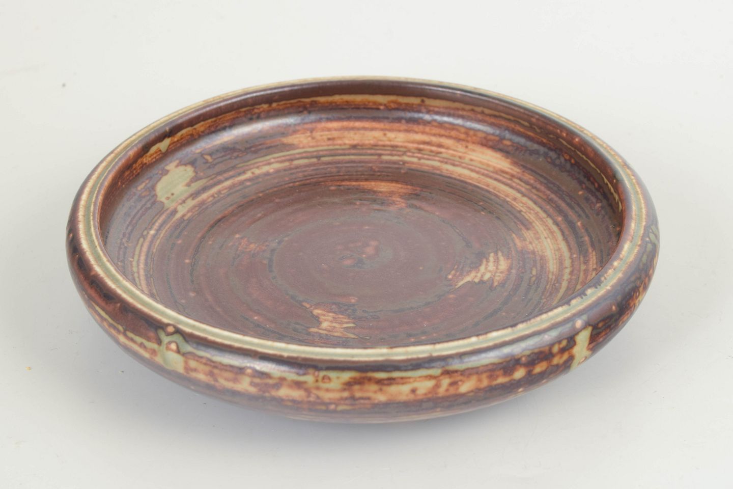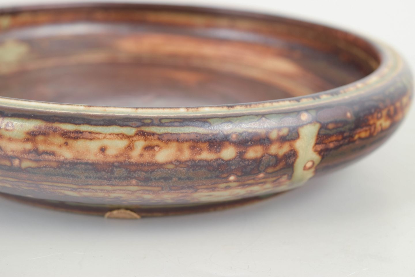 Carl Halier for Royal Copenhagen Skål / Fad.Lav, bred skål udført i stentøj med markant koncentrisk drejestruktur og dyb, levende glasur i mørke jordfarver med brune, sorte og varme okkerfarvede gennembrud. Overfladen fremstår taktil og grafisk med tydelige drejespor, som giver skålen et kraftfuldt og karakterfuldt udtryk.