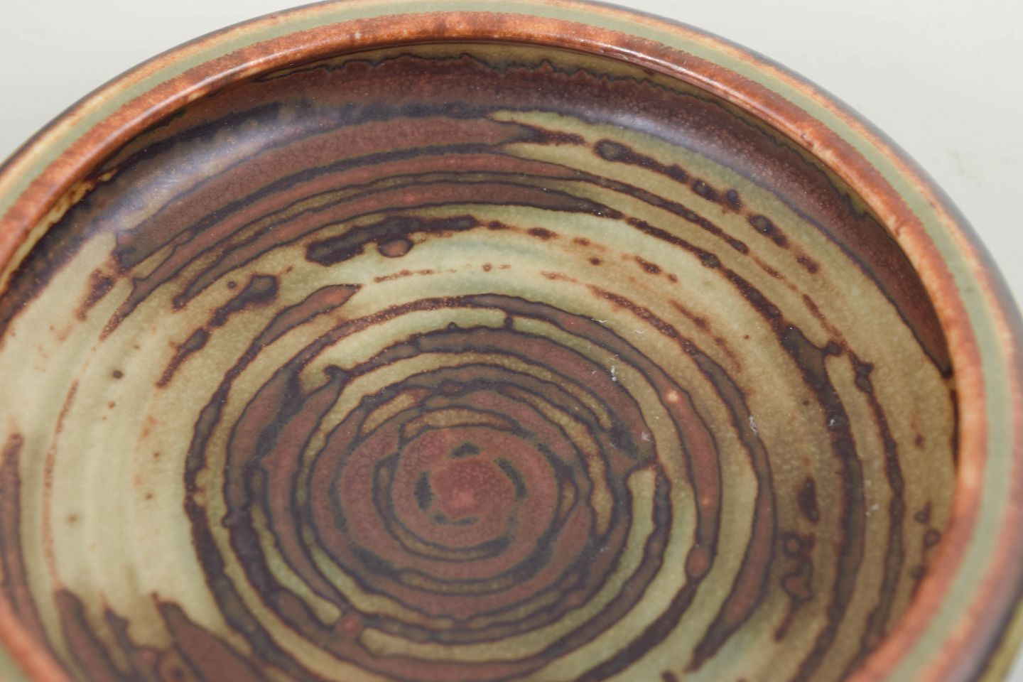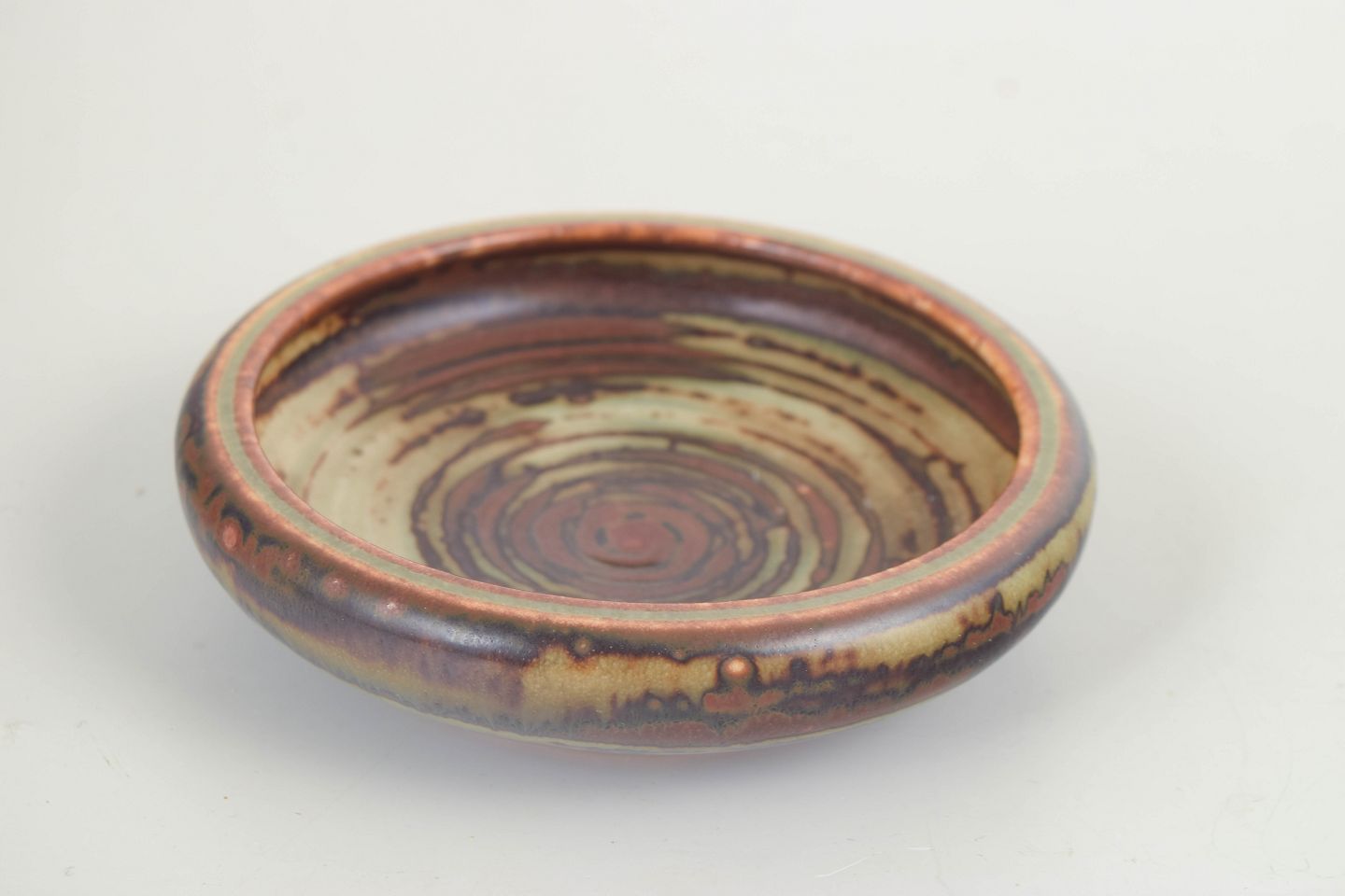 Carl Halier for Royal Copenhagen Skål / Fad, sent 1900-tal.Lav skål udført i stentøj med koncentrisk, cirkulær dekoration og levende glasur i jordfarver med grønne, brune og rustfarvede nuancer. Den enkle, flade form kombineres med et markant grafisk udtryk i glasuren, som giver skålen et stærkt dekorativt præg.