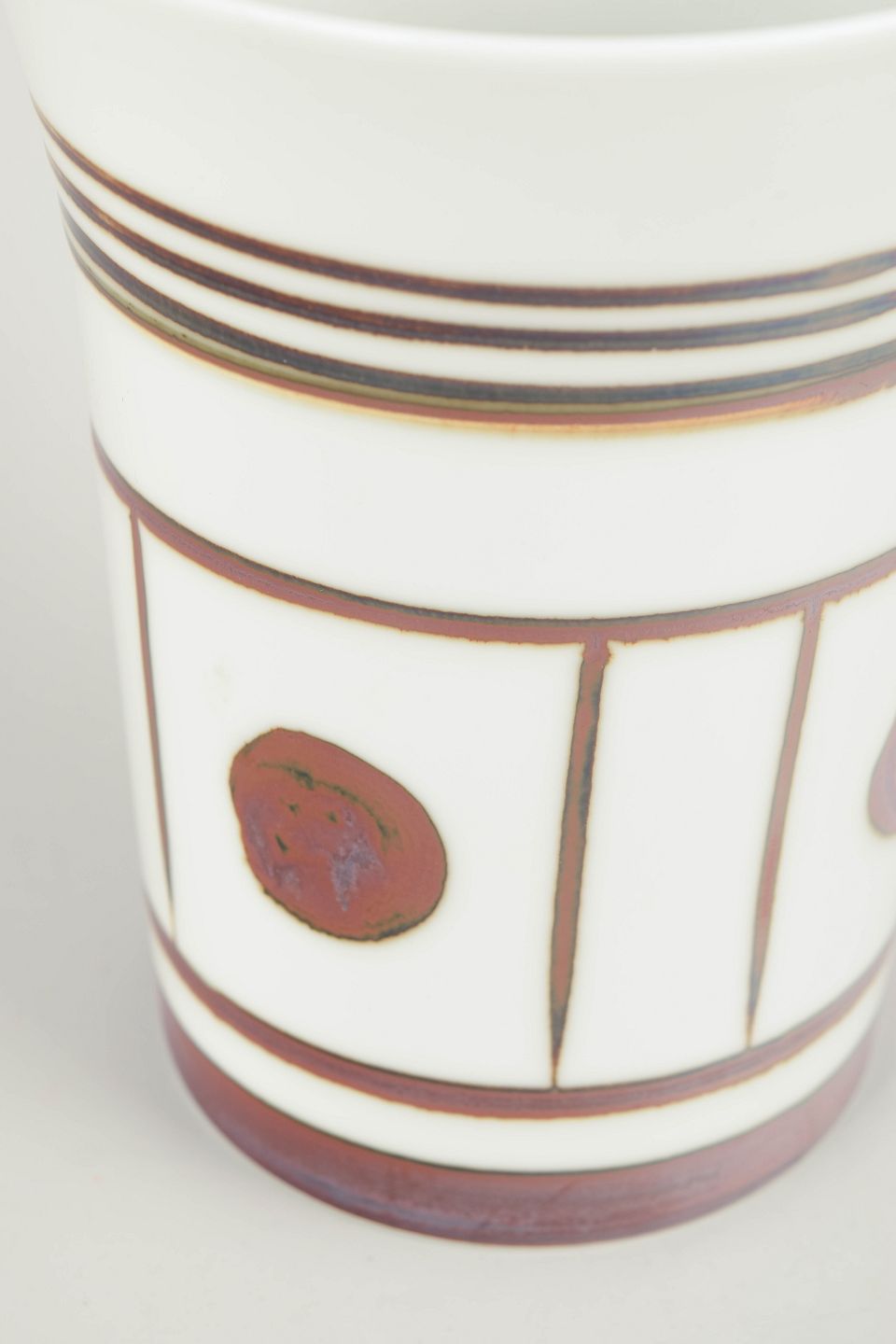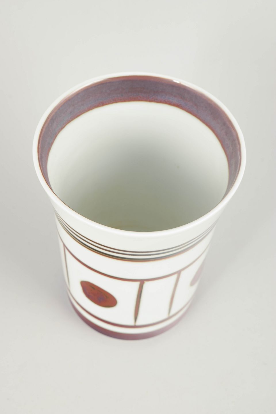 Trude Barner Jespersen for Bing & Grøndahl “Trude” vase, 1970’erne.Cylinderformet vase i fajance med hvid glasur og grafisk dekoration i brunlige og violette toner. Dekoren består af bånd, linjer og cirkulære felter, typisk for serien Trude, der afspejler 1970’ernes enkle, modernistiske formsprog.