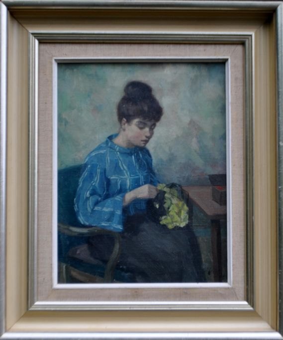 Helme, Helge (1894–1987) Dänemark: Frau beim Nähen von Kleidung. Öl auf Leinwand. Signiert: H. Helme. Höhe: 35,5 cm. Breite: 27,5 cm.Gerahmt: H: 50 cm. B: 42 cm.