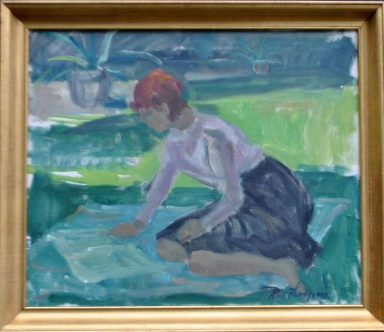 Leepin, Robert (1885–1967) Dänemark: Mädchen mit Buch im Garten. Öl auf Leinwand. Signiert: Rob. Leepin. H: 46 cm. B: 55 cm.Gerahmt: H: 53 cm. B: 62 cm.