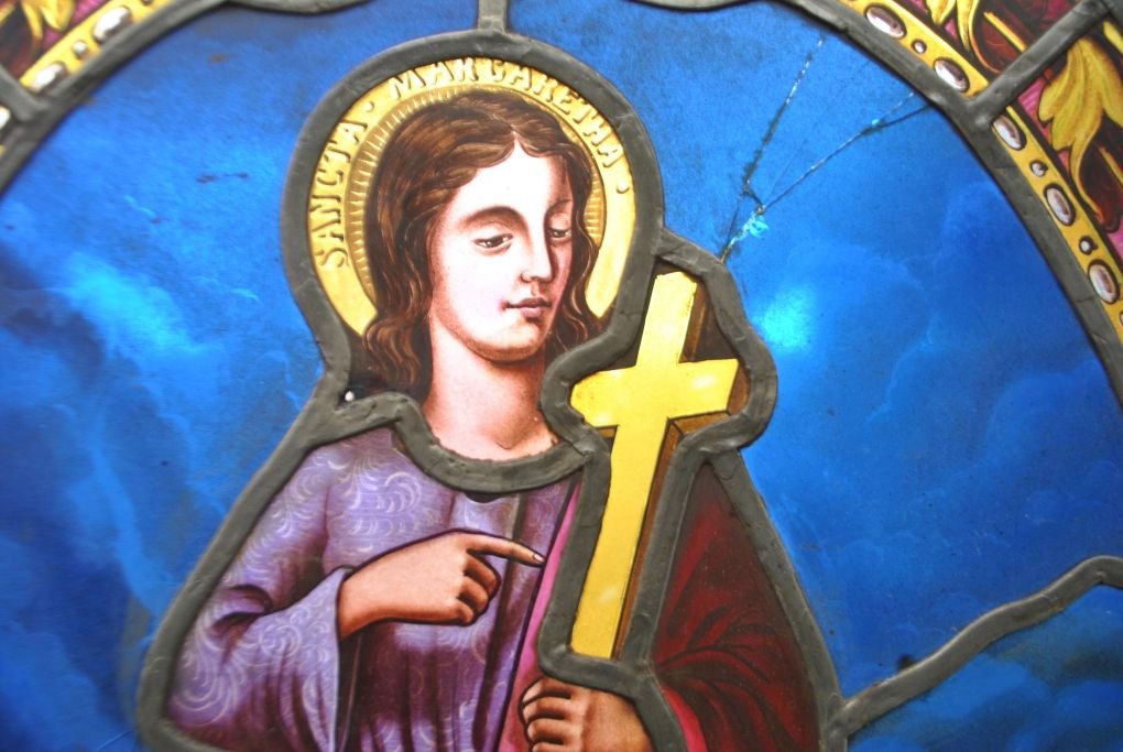 Katholisches Kirchenmosaik, Buntglas, 19. Jahrhundert. Motiv: Santa Margherita. Die stehende Margherita trägt ein Kreuz, zu ihren Füßen liegt ein Drache. Gerahmt in einem Eisenrahmen mit Aufhängung. 96,5 x 64 cm.