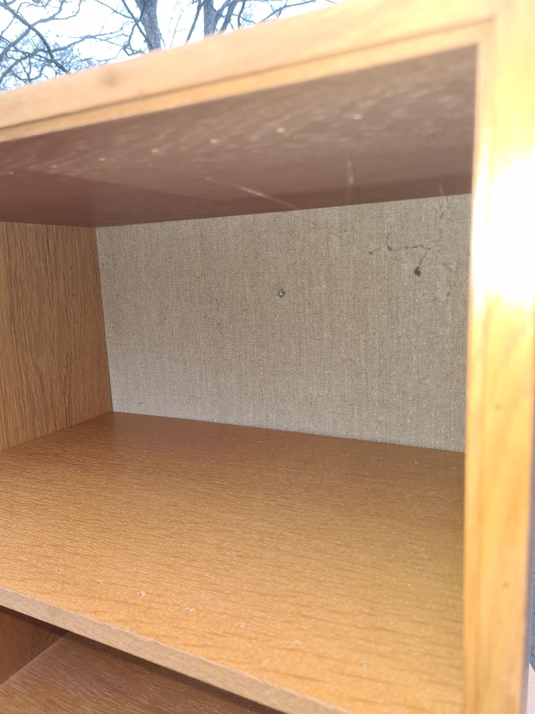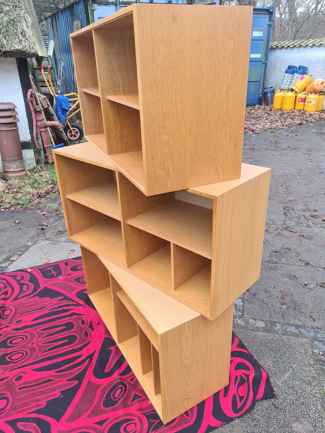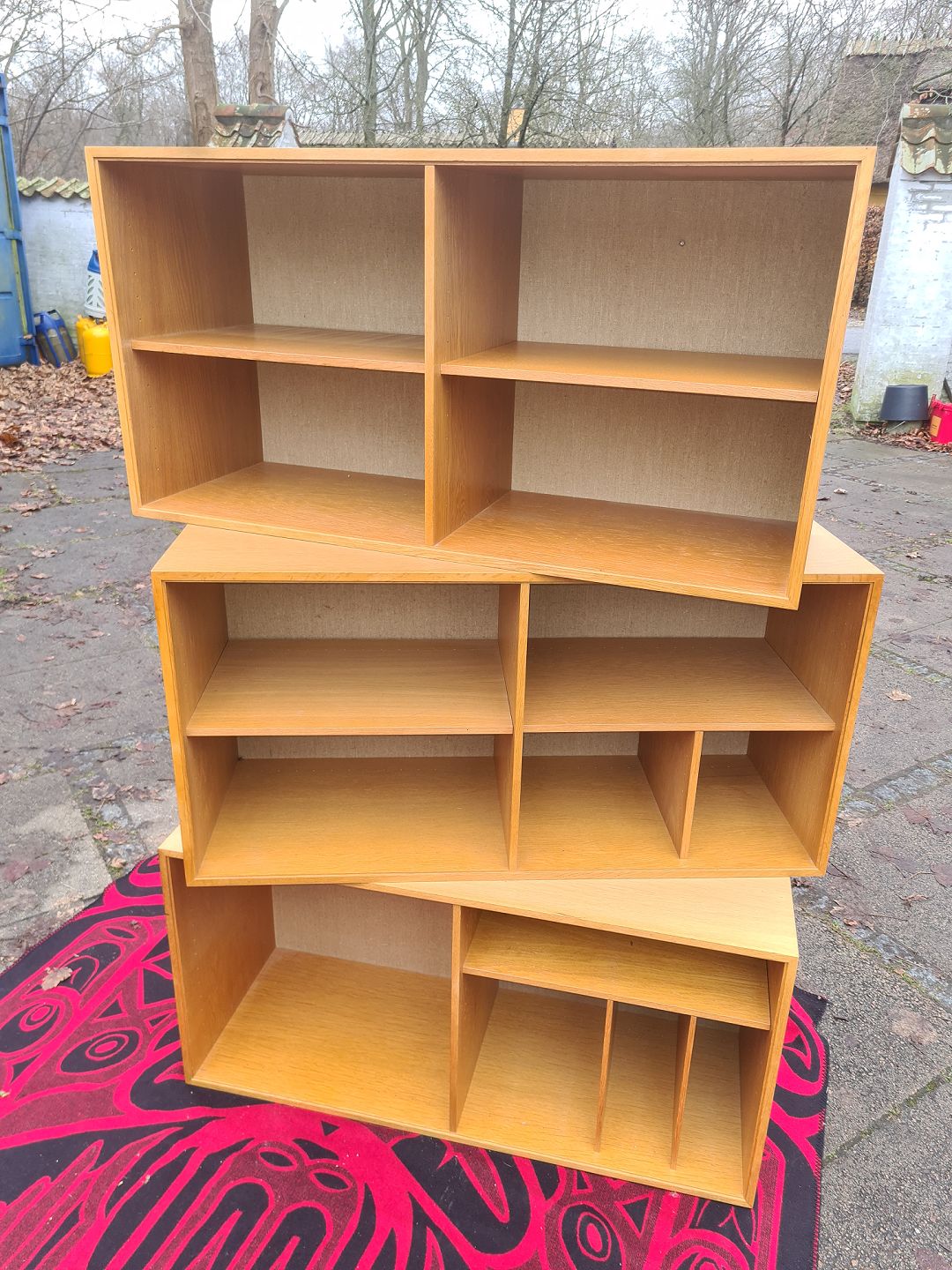 3 bogkasser i finéret eg og med hessian beklædt bagbeklædning. Ydført hos HG Funiture i 1970'erne. Fremstår pæne og velholdte uden de store brugsspor. Højde 51,5 cm. Bredde 101 cm. Dybde 36 cm.