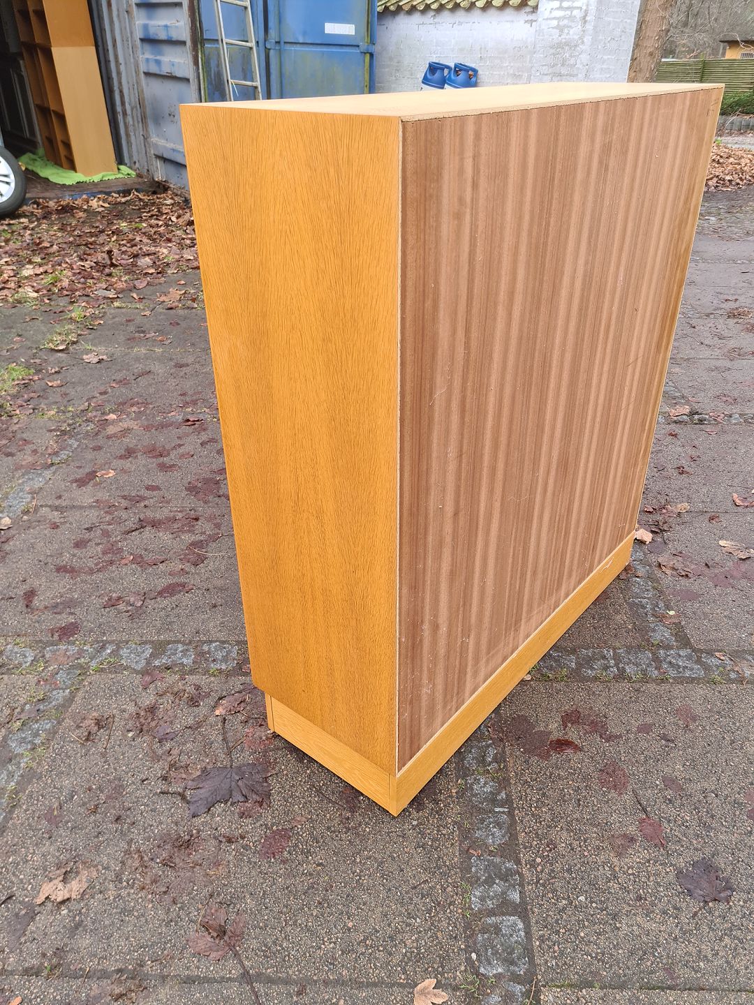 Reol i finéret eg med underskab og hessian beklædt bagbeklædning. Ydført hos HG Funiture i 1970'erne. Fremstår pæn og velholdt uden de store brugsspor. Højde 112 cm. Bredde 101 cm. Dybde 36 cm.