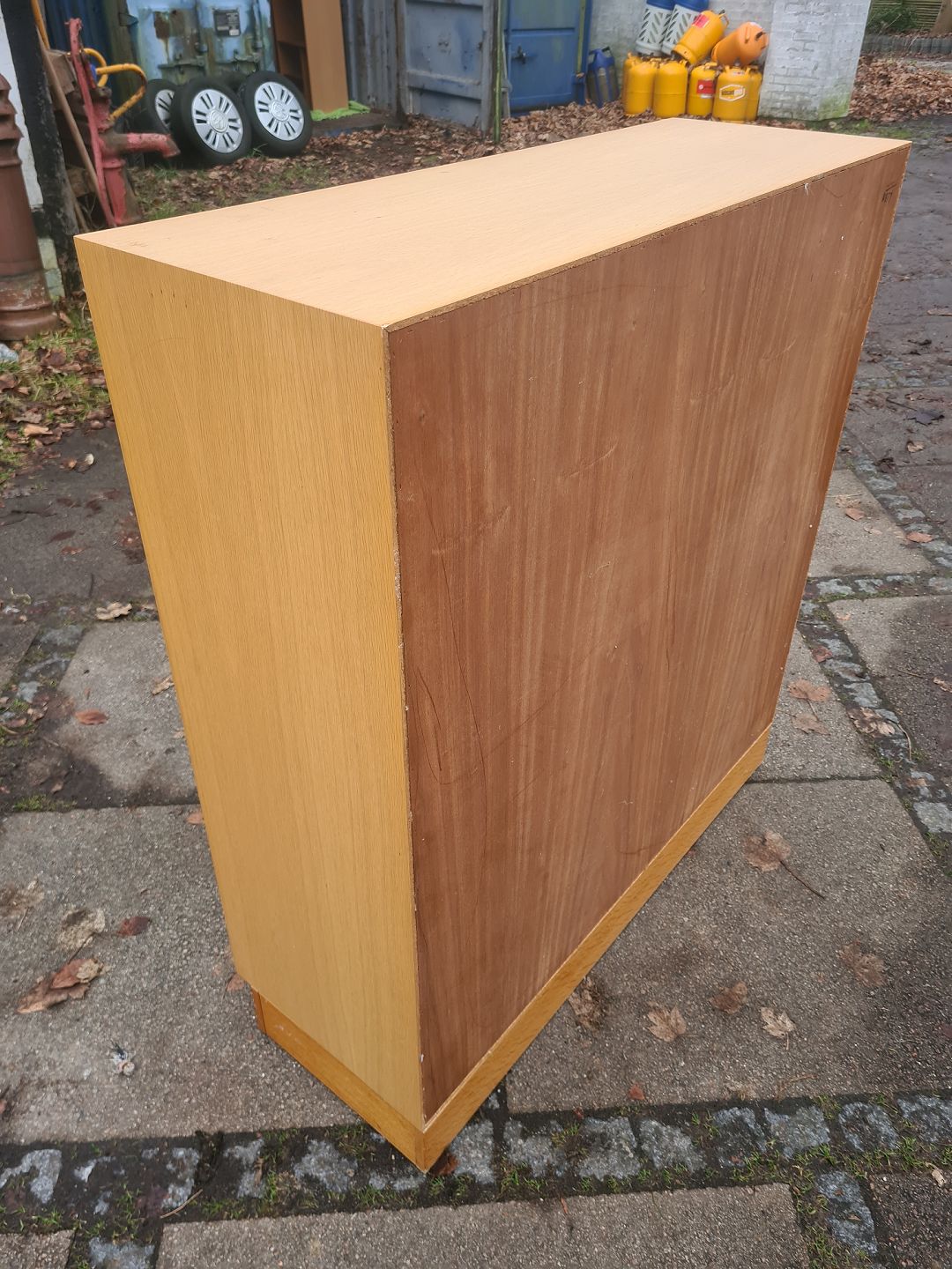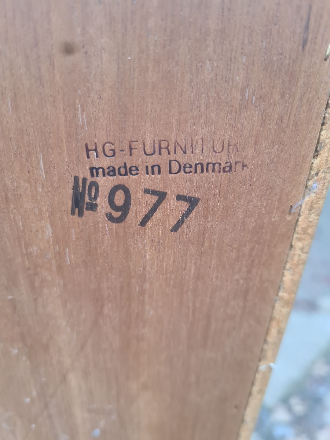 Reol i finéret eg med underskab og hessian beklædt bagbeklædning. Ydført hos HG Funiture i 1970'erne. Fremstår pæn og velholdt uden de store brugsspor. Højde 112 cm. Bredde 101 cm. Dybde 36 cm.
