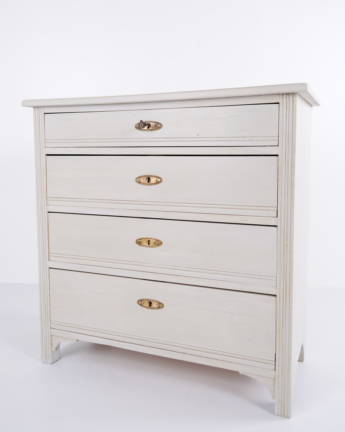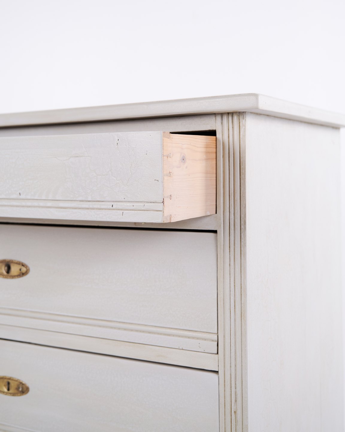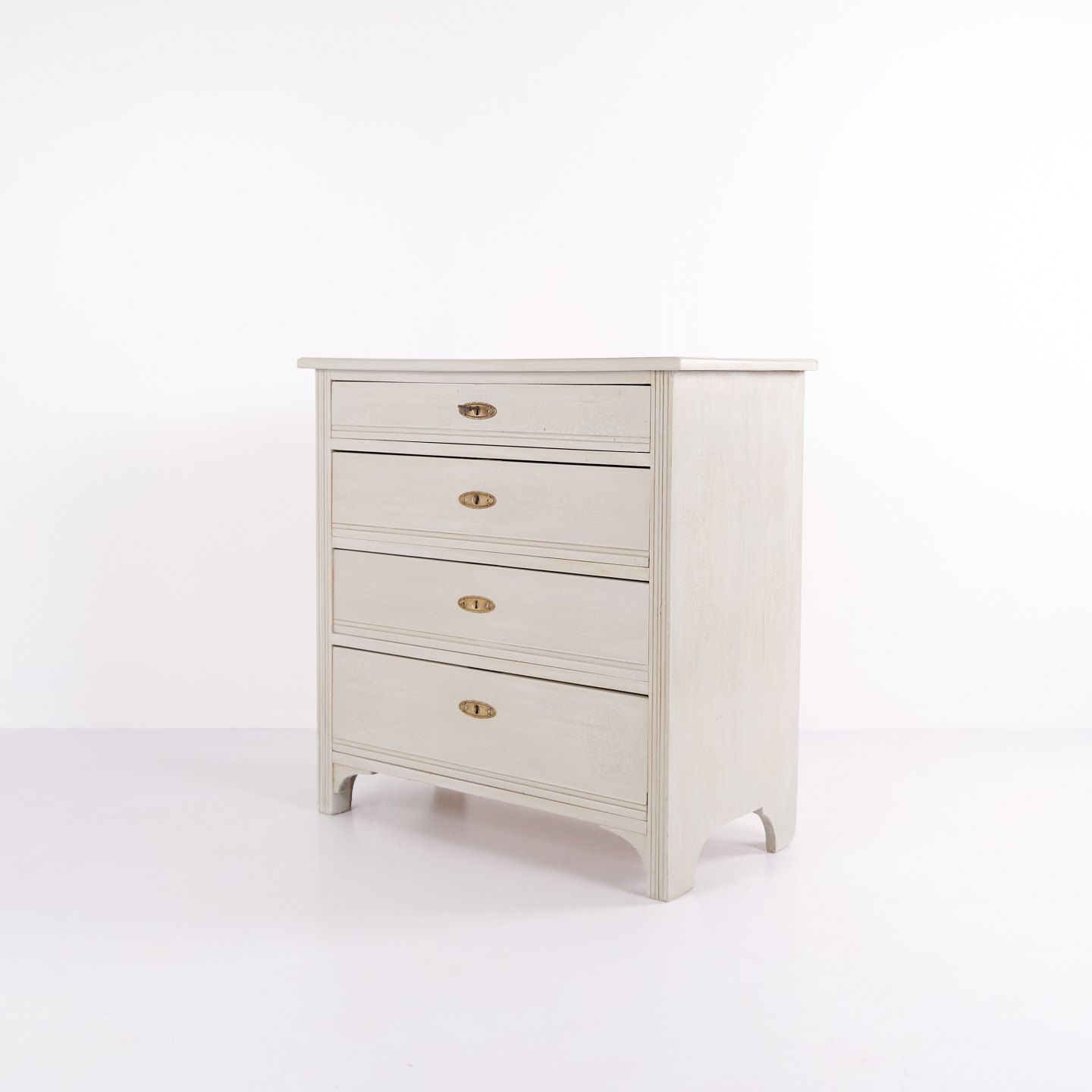 Antike Kommode aus den 1890er-Jahren mit vier Schubladen. Grau gestrichenes Holz und klassisches Formensprach mit schöner Patina.— Zeitraum: 1890er-Jahre