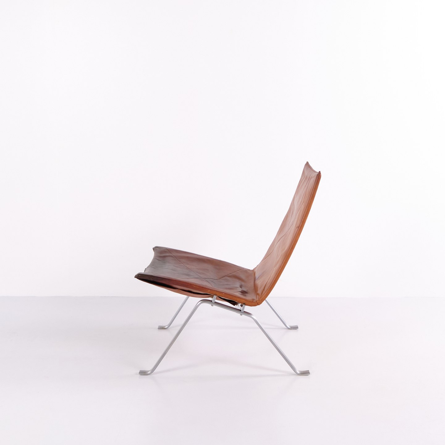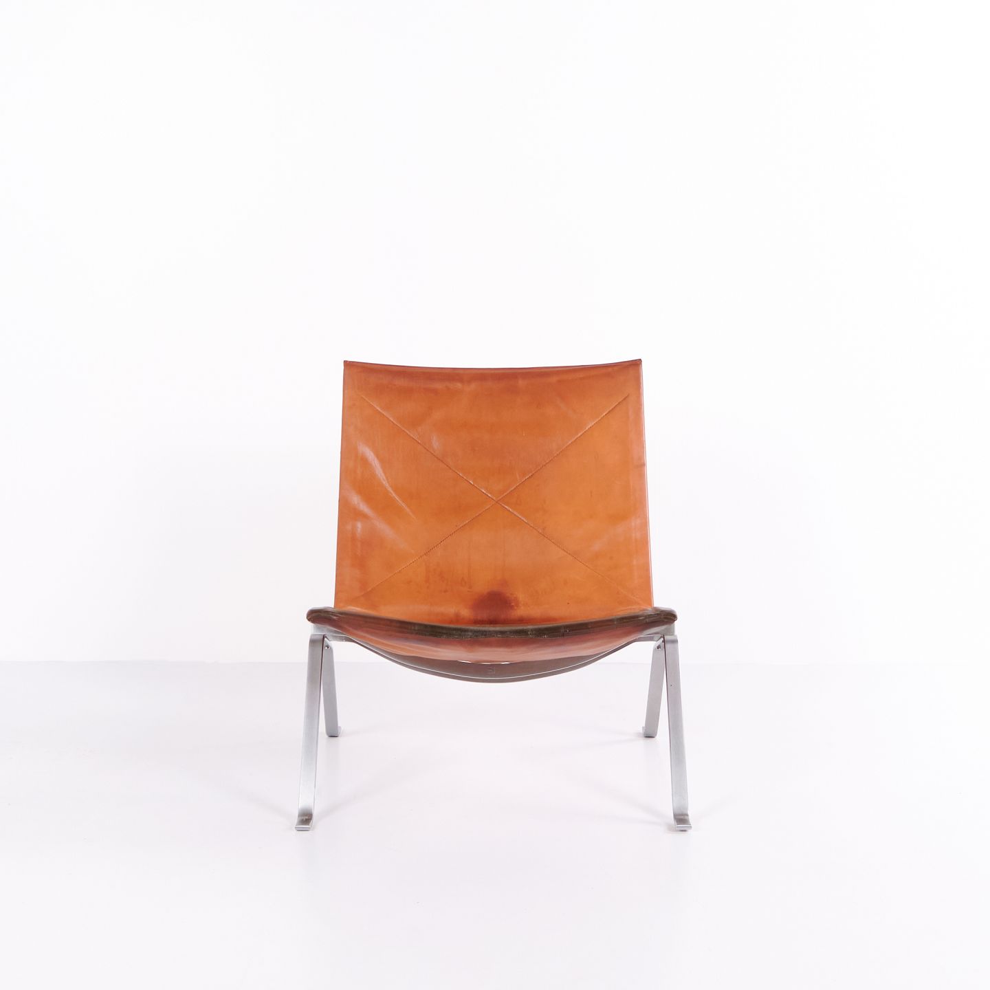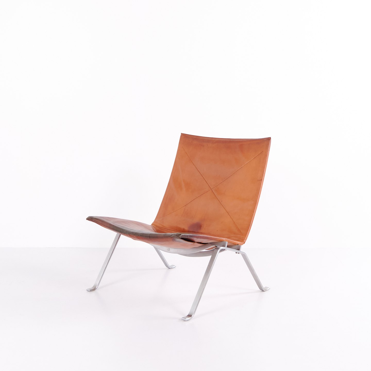 PK22 Sessel von Poul Kjærholm für E. Kold Christensen. Originalpolsterung aus patiniertem Cognac-Leder. Dänische Designikone der 1950er-Jahre.— Designer: Poul Kjærholm