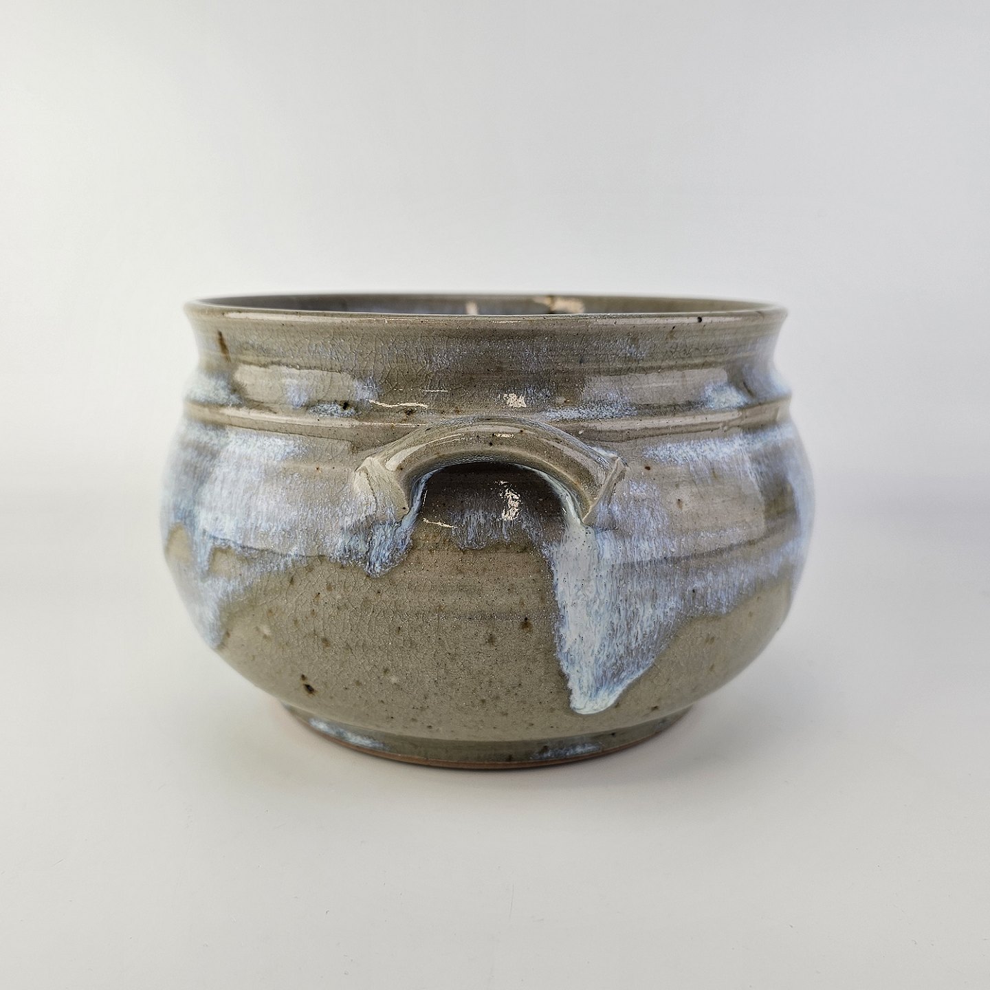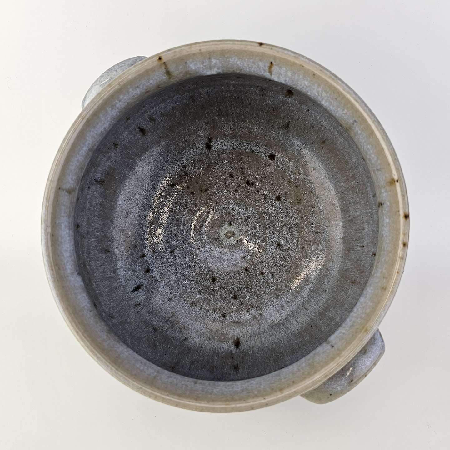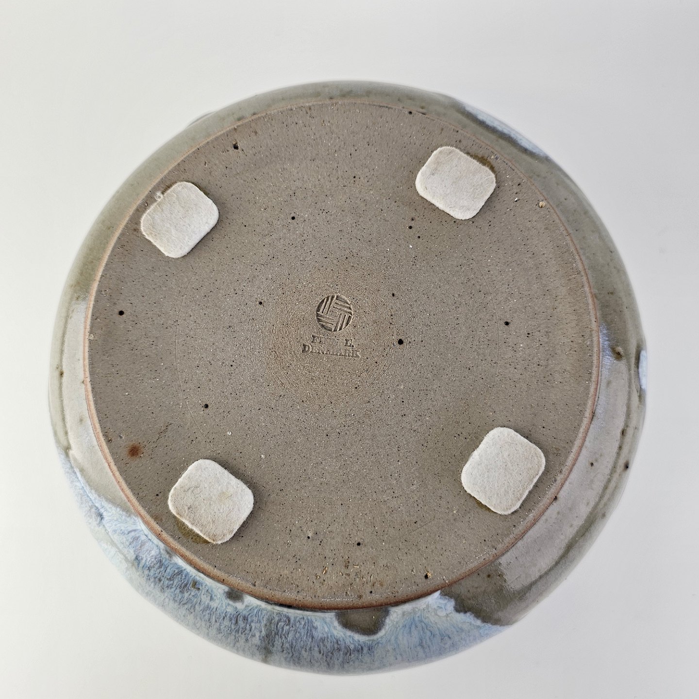 Blålig og grønlig keramik unika skål med 2 hanke med krakkeleringer i glasuren.Signeret Finn L, Denmark