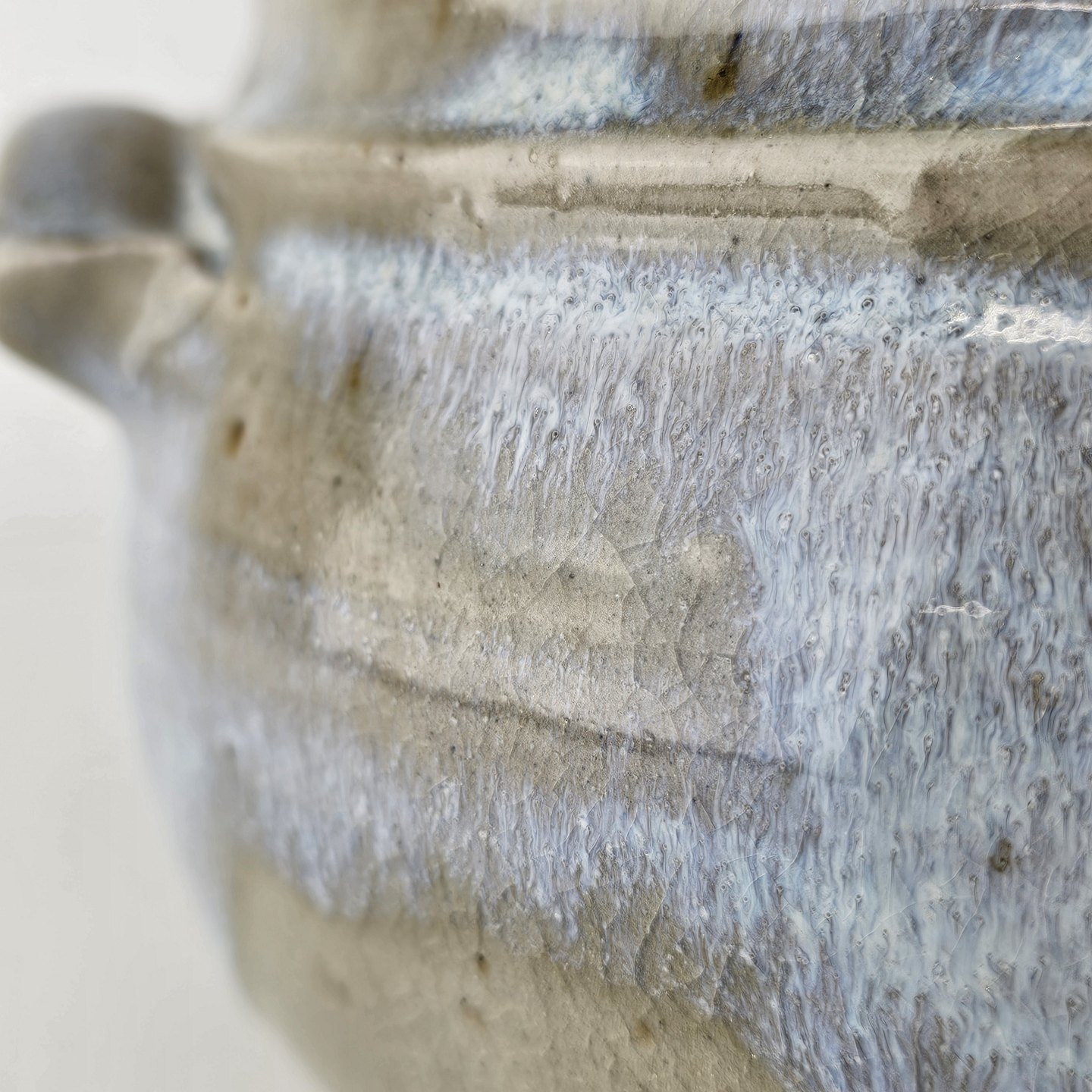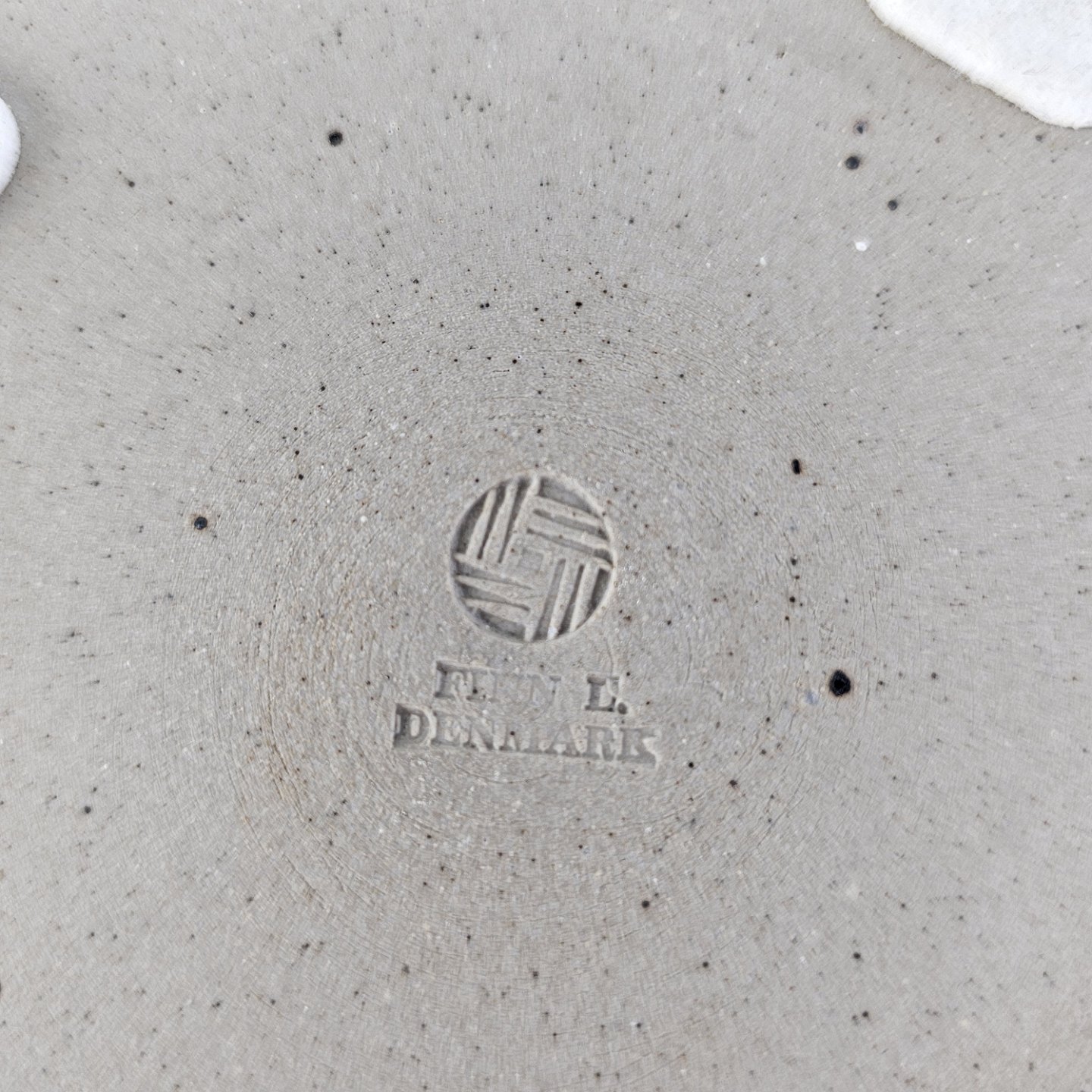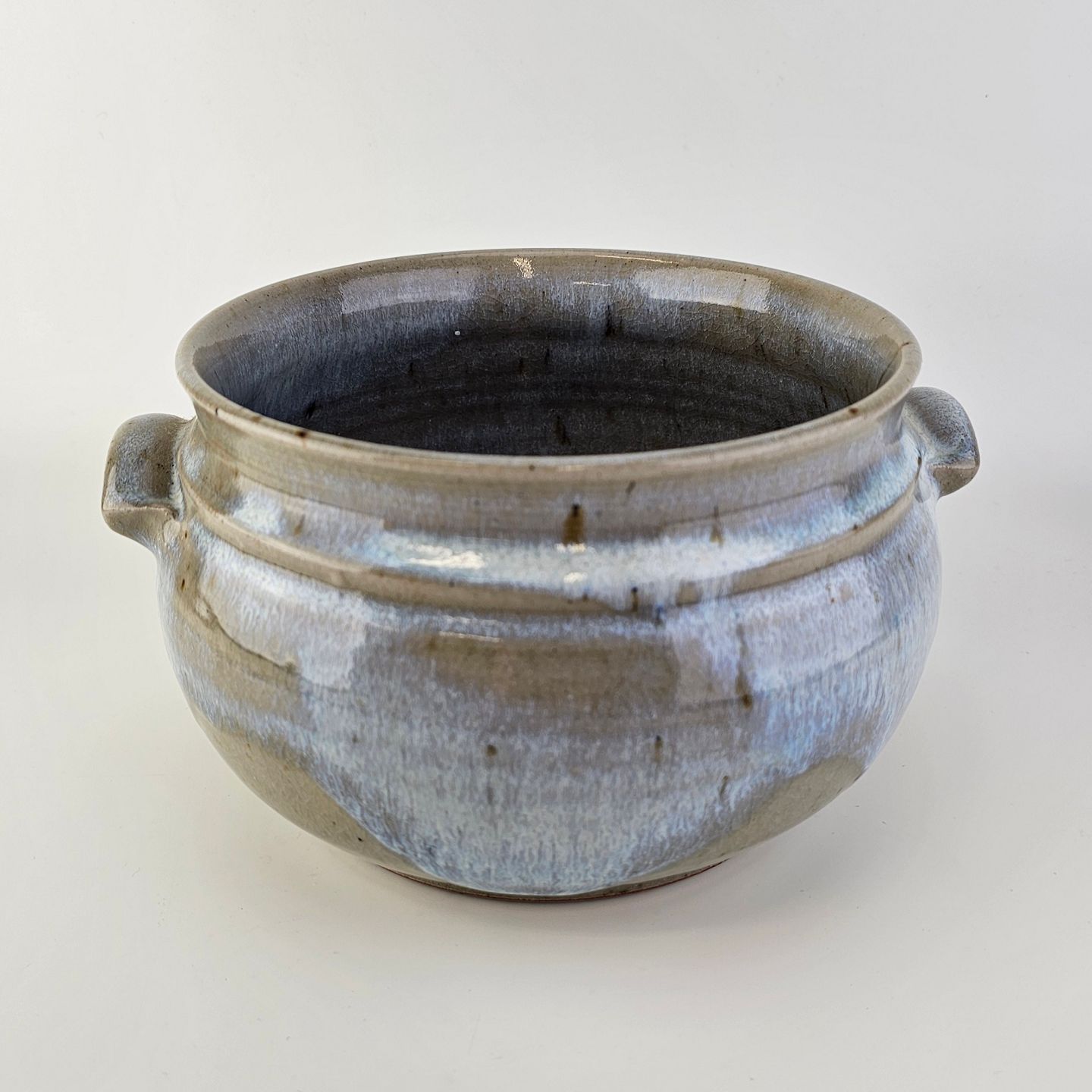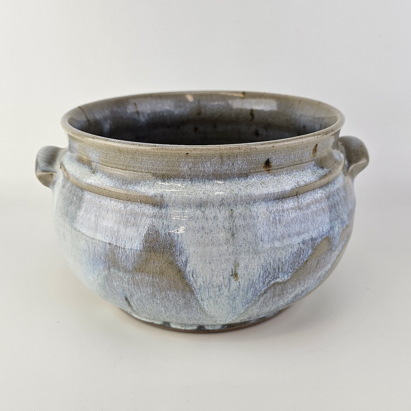 Blålig og grønlig keramik unika skål med 2 hanke med krakkeleringer i glasuren.Signeret Finn L, Denmark