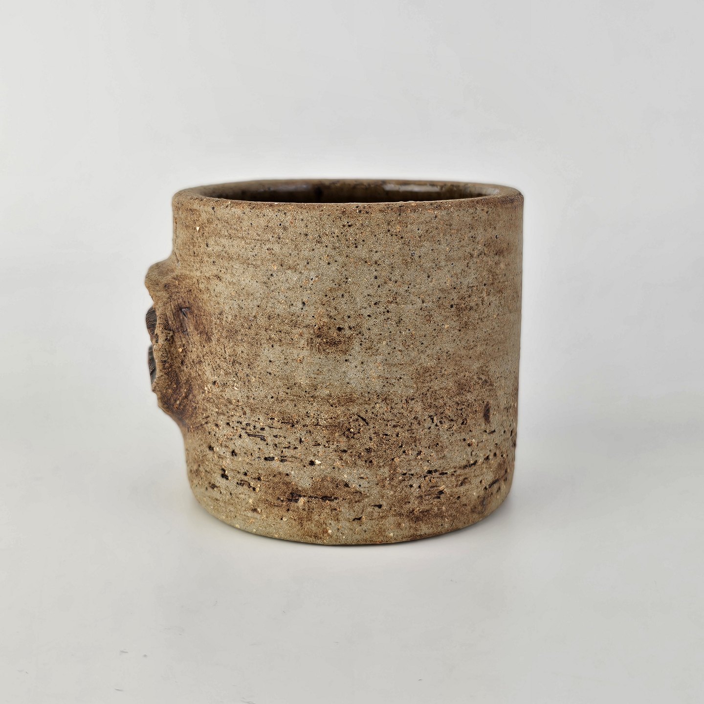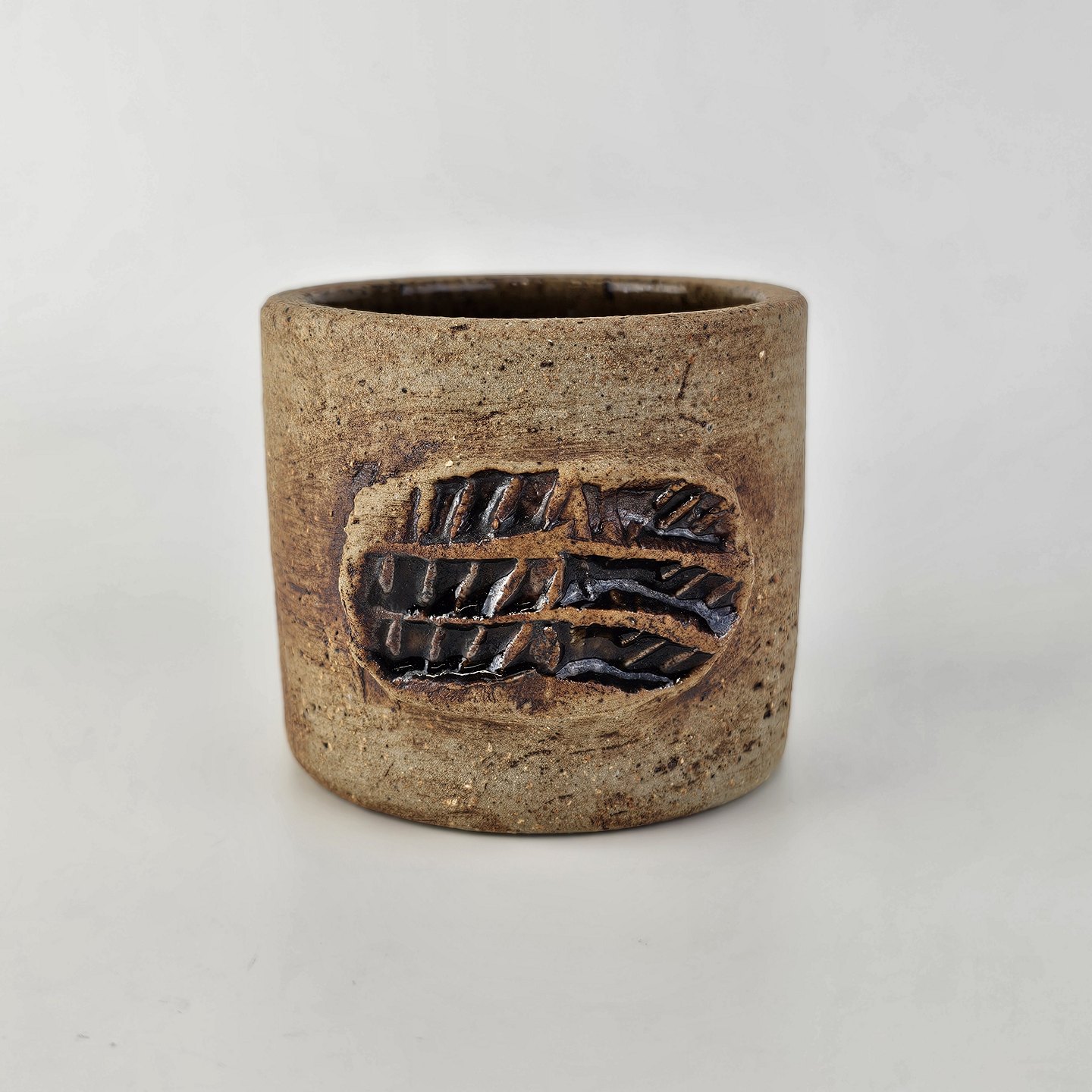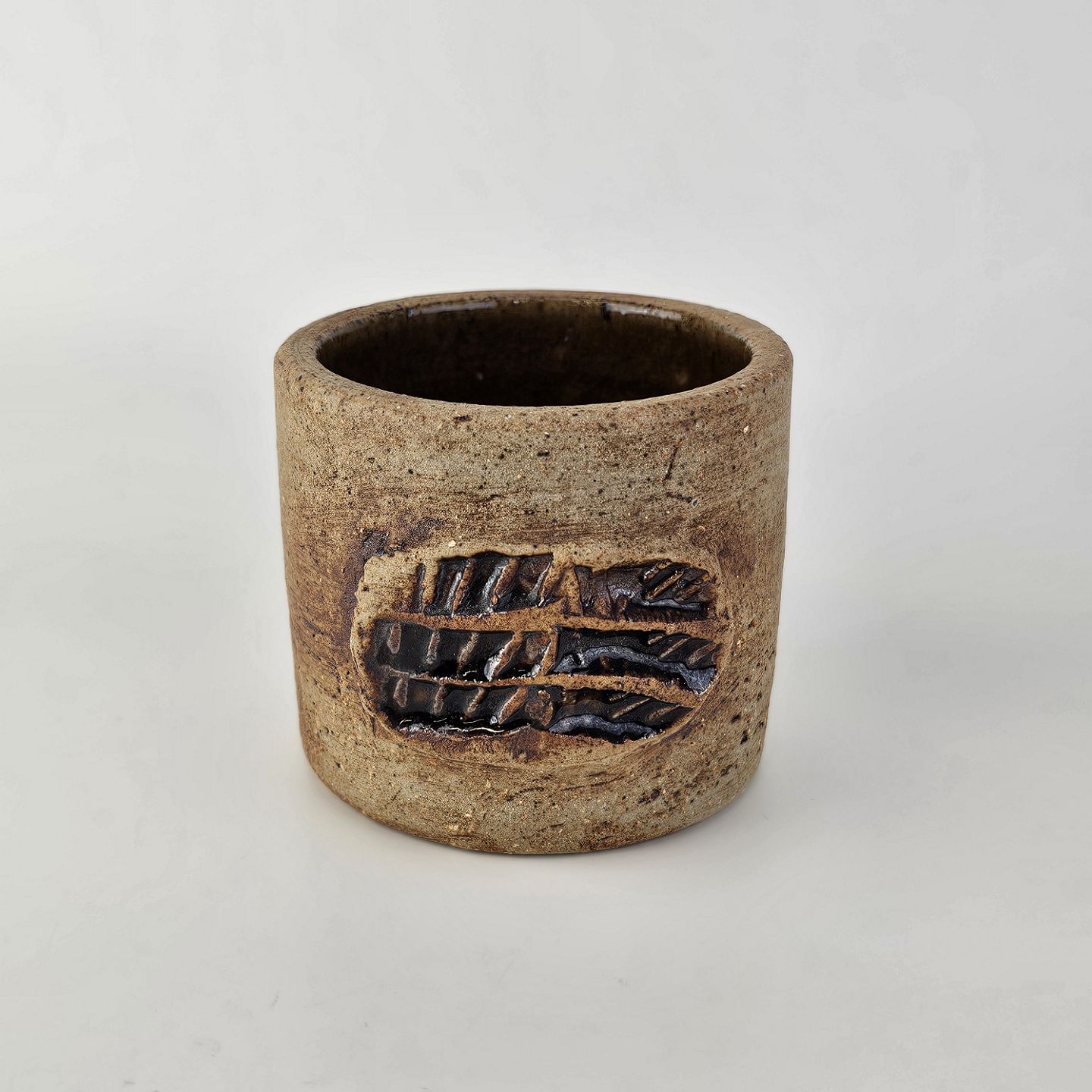 Brunlig krukke, krus, kop, vase med lille relief udvendigt. Den er uglasseret udvendigtSigneret CW