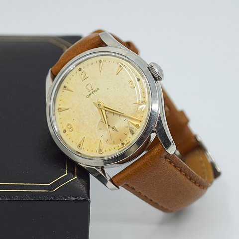 Omega Jumbo armbåndsur i stål. Ref. 2639-8. Cal: 265. Omega herreur årgang 1951. Diameter 34 mm. Manuelt optræk. Med brun læderrem. Nyserviceret og med ny rem, fremtræder i pæn vintage stand.Kontakt os gerne,