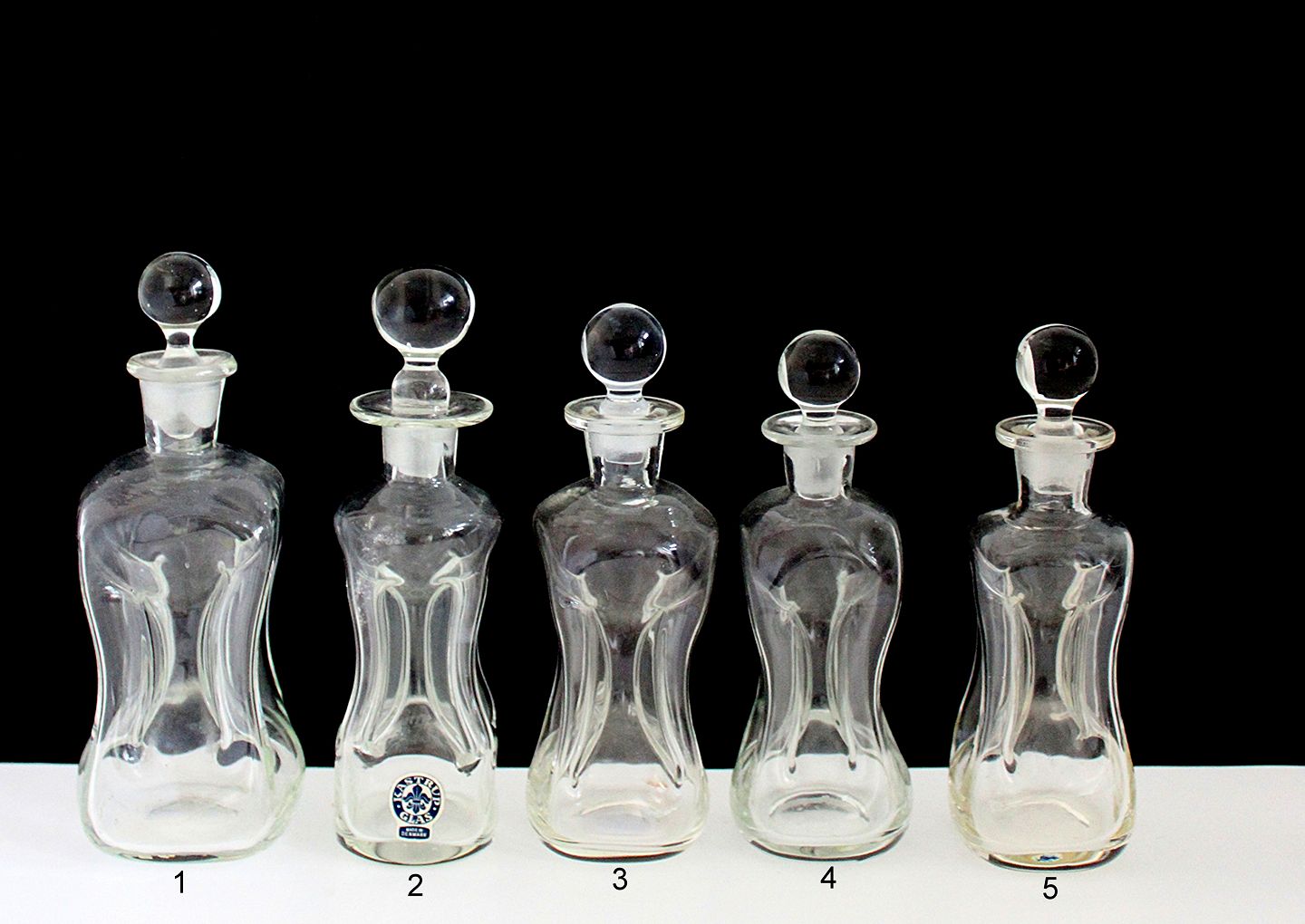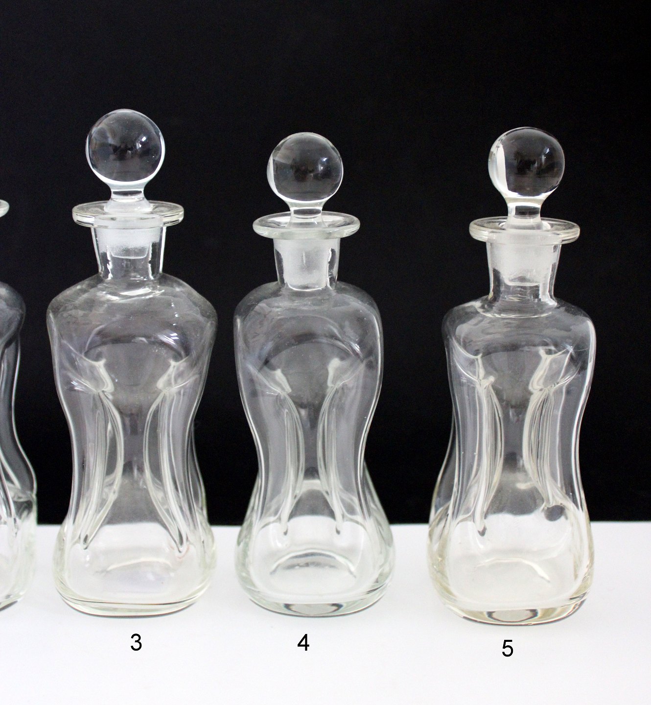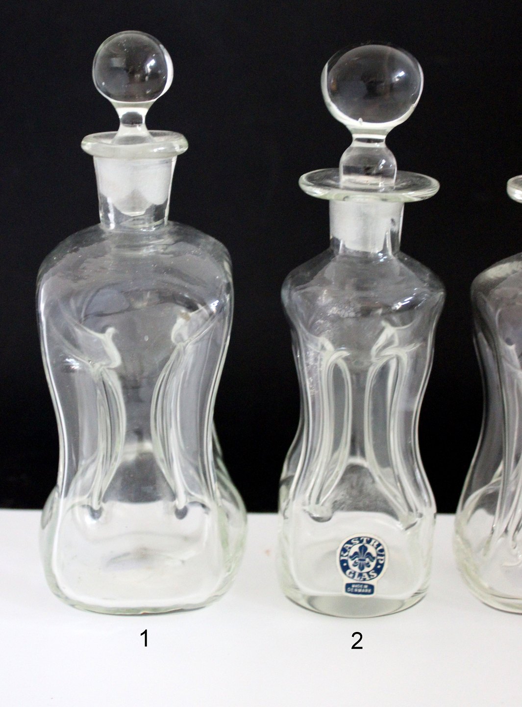 Kastrup/Holmegaard glasværk. Små kuvert klukflasker i klar glas. Almindelig brugsspor. Propperne formodes at høre til flaskerne fra start.1. Højde 16,5 cm. Bredde nederst 6 cm. Pris: 125 kr.