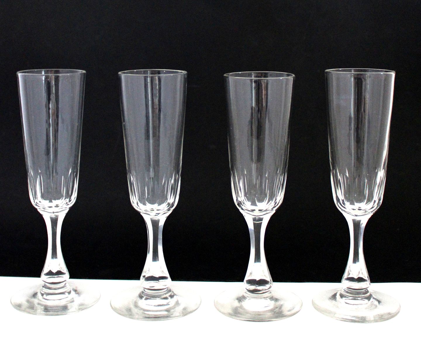 Derby Champagnefløjter. Oliveslibning i kumme, slebet stilk og rundslebet bund. Højden varierer fra 15,7 til 16,1 cm. Almindelig aldersbrusspor med den tids skavanker og skygger. Pris samlet for 4 stk: 800 kr.