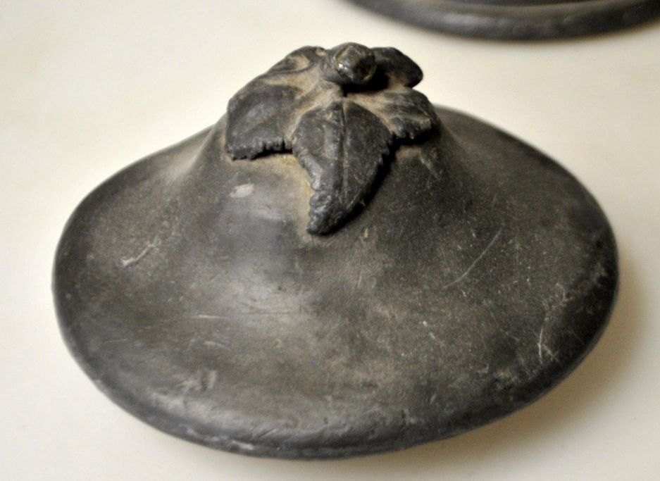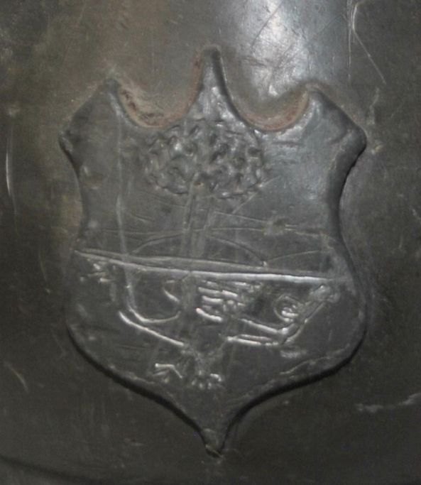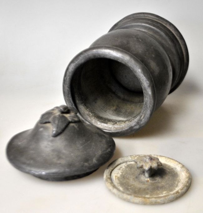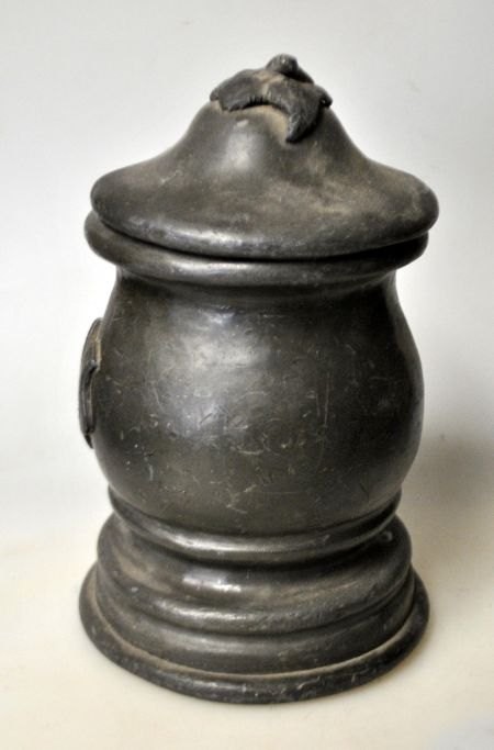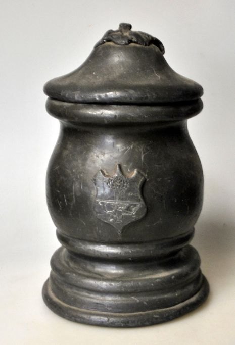 Barocke Tabakdose aus Zinn, 18. Jahrhundert. Seitlich mit Wappen. Innen mit Gewicht. Deckel mit Blattdekor. Höhe: 18 cm.Bestellnummer: 28606