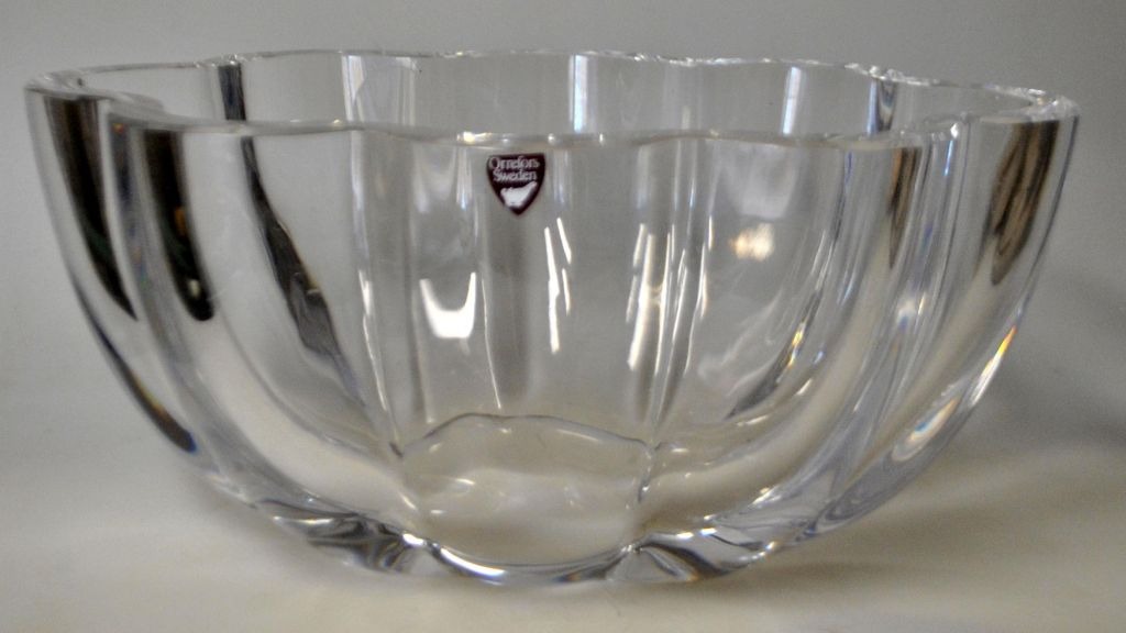 Große Kristallschale von Orrefors, 20. Jahrhundert. Schweden. 8454-11. Gestempelt und mit Etikett. L: 26,5 cm. B: 19,5 cm. H: 12 cm.Bestellnummer: 28607