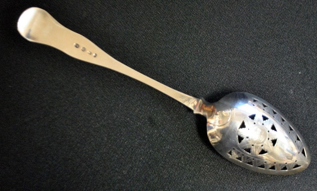 Carl Peter Foght (1802–1884), Kopenhagen, Dänemark: Erdbeerlöffel aus Silber. 1841. Muschelmuster. Durchbrochene Form mit Verzierungen auf der Unterseite. Gestempelt mit Meister-, Stadt-, Gardein- und Monatsmarke. Länge: 30 cm. Gewicht: 104 Gramm.Bestellnummer: 28669
