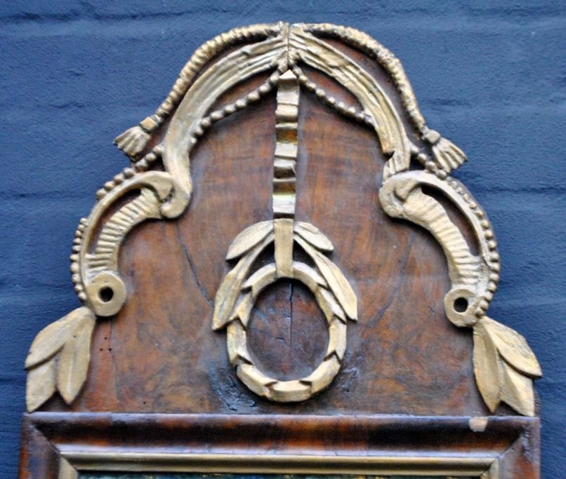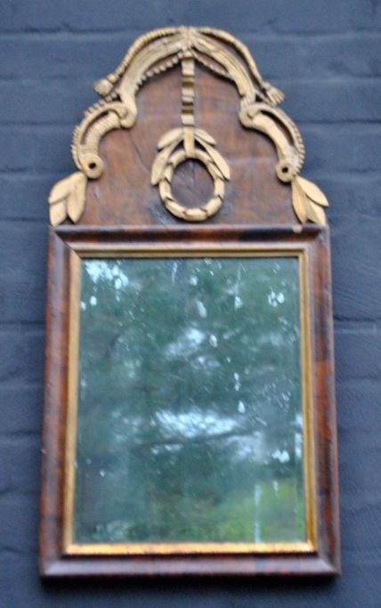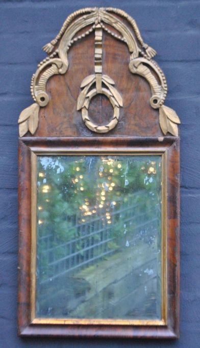 Dänischer Louis-XVI-Spiegel, Nussbaumfurnier, um 1780. Höhe: 70 cm. Breite: 34 cm.Bestellnummer: 28706