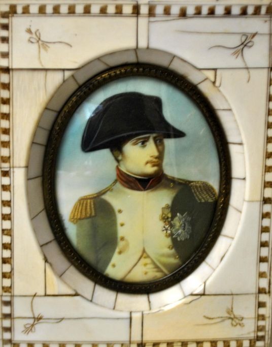 Miniaturmalerei, Porträt von Napoleon Boneparte. 19. Jahrhundert. Signiert: De Laroc. Oval. 8,5 x 6,5 cm. Gerahmt in einem französischen Knochenrahmen mit Verzierungen. 14 x 11 cm.Bestellnummer: 28716