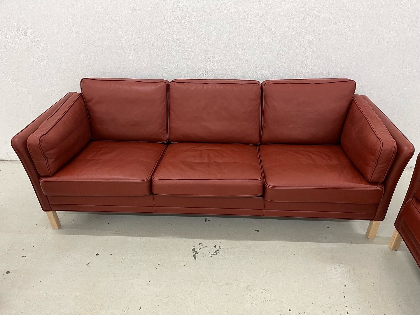 1.655Nur zu besonderen Anlässen genutztes Sofa-Set bestehend aus den Sofas MH2225 (3- und 2,5-Sitzer) und dem Sessel MH80 Queen's Chair, bezogen mit cognacfarbenem Gefion-Leder und mit Buchenholzbeinen (40 x 40 cm). Neupreis: 106.217 SEK. Die Möbel hatten nur einen Besitzer, der sie ausschließlich zu besonderen Anlässen nutzte. Das Set befindet sich daher in einem sehr guten Zustand und stammt aus einem Nichtraucherhaushalt ohne Haustiere. Das Modell MH2225 wurde 1971 auf den Markt gebracht und ist das älteste Modell im Sortiment von Mogens Hansen. Es ist nach wie vor beliebt und zählt zu den gefragtesten Londoner Sofas des Unternehmens. Die anhaltende Nachfrage führt dazu, dass wir häufig zufriedene Zweitkäufer begrüßen dürfen. Das Design zeichnet sich durch die elegant geschwungenen Armlehnen mit schöner Einfassung sowie eine relativ geringe Sitztiefe aus, die für besonders hohen Sitzkomfort sorgt. Die Serie bietet verschiedene Varianten, darunter Sofas in unterschiedlichen Größen, Ecksofas und Sessel, wod
