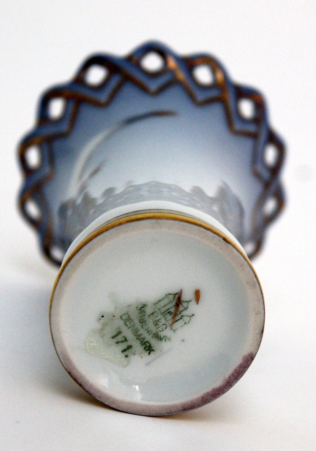 Bing & Grøndahl, Måge med guld, Kuvertvase med hulkant. Nr. 171. Højde 7,5 cm. Øverste diameter 6 cm. I. sortering. Pris: 175 kr. stk. Lager: 1 Händler