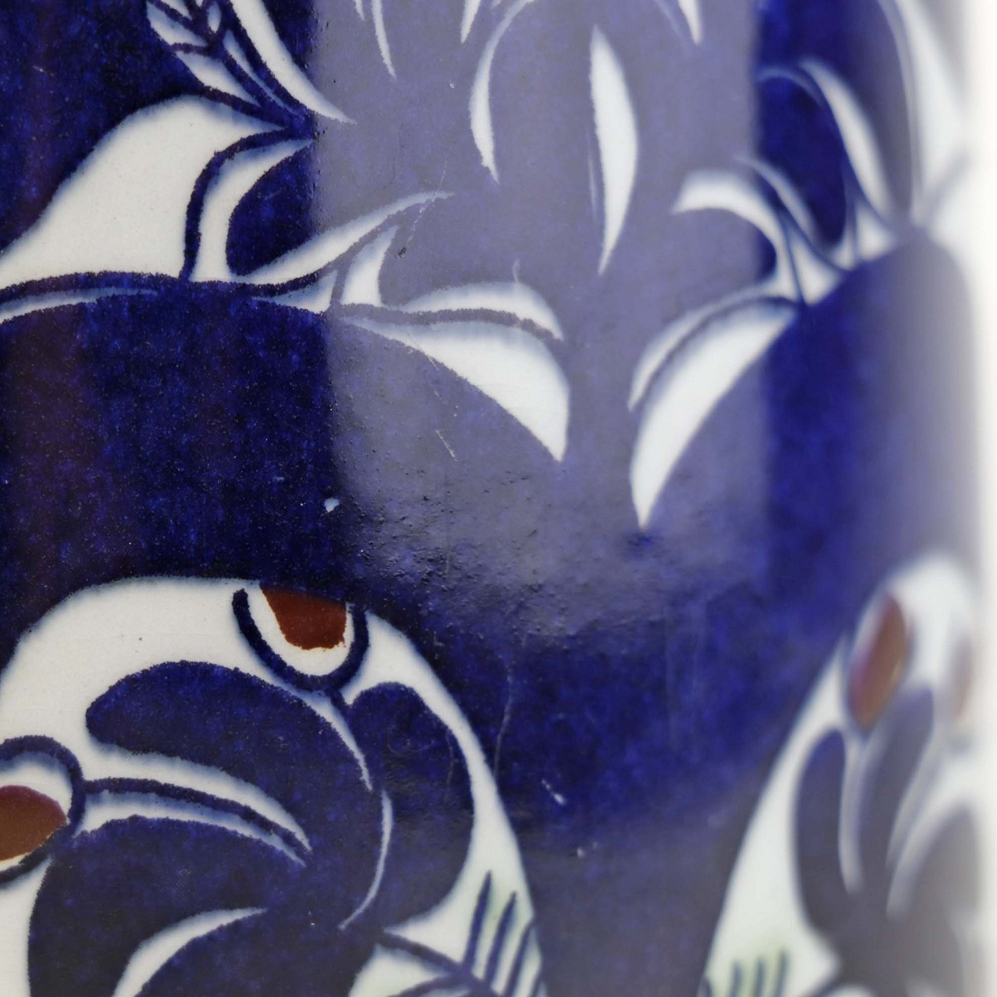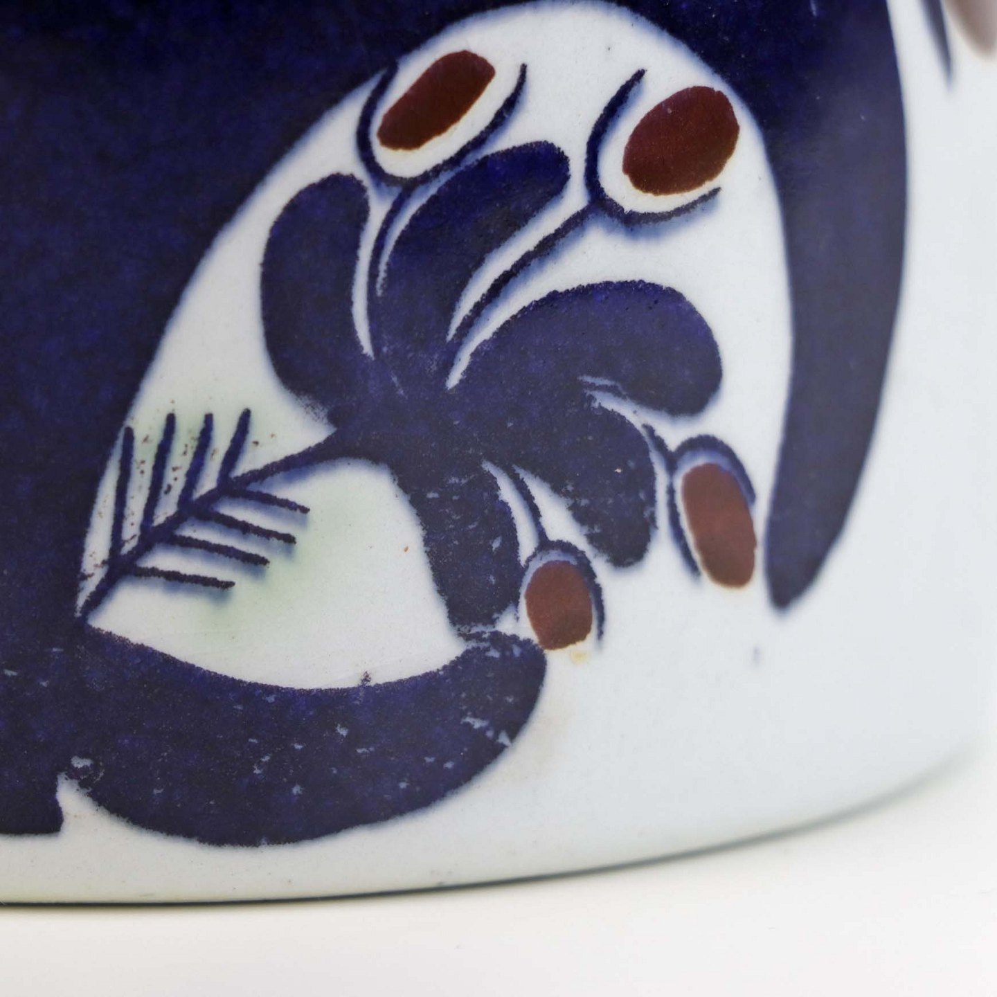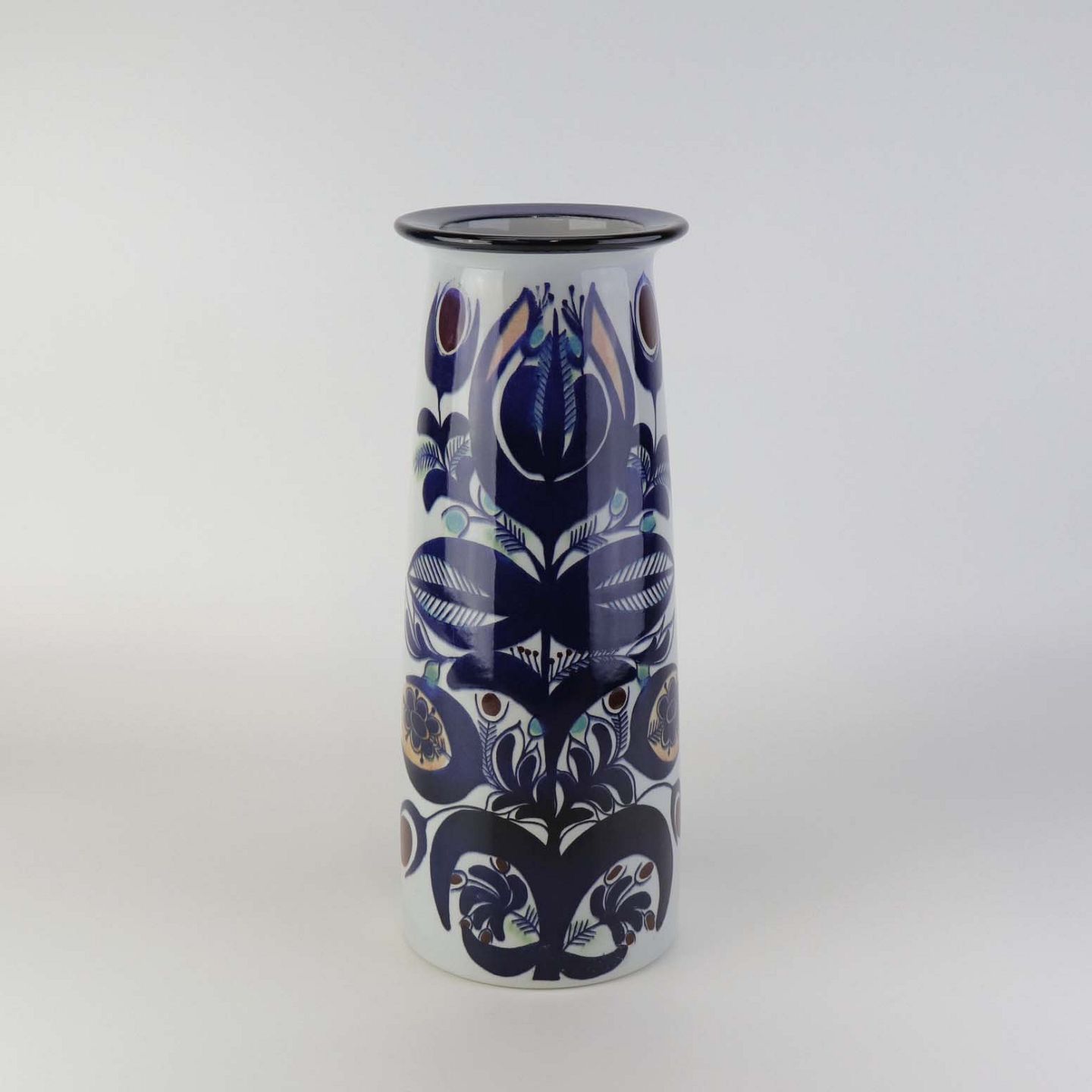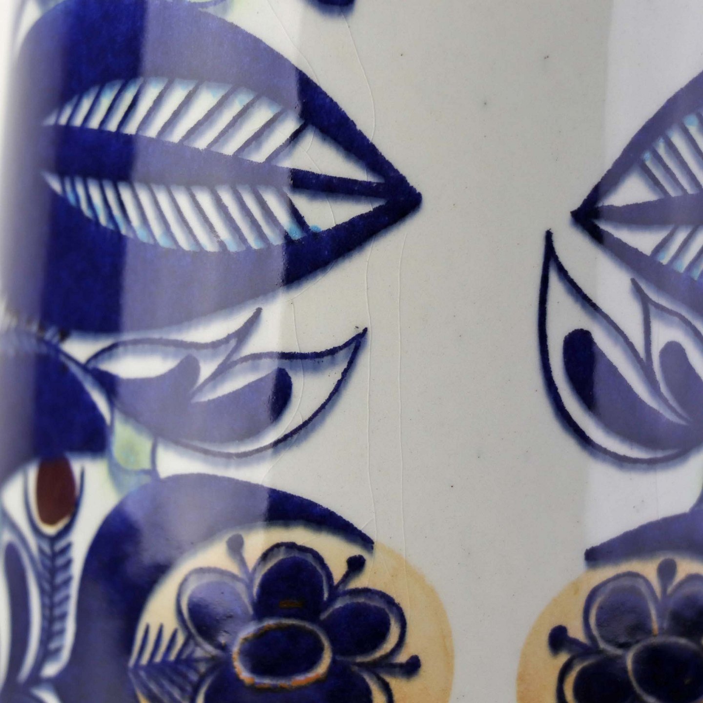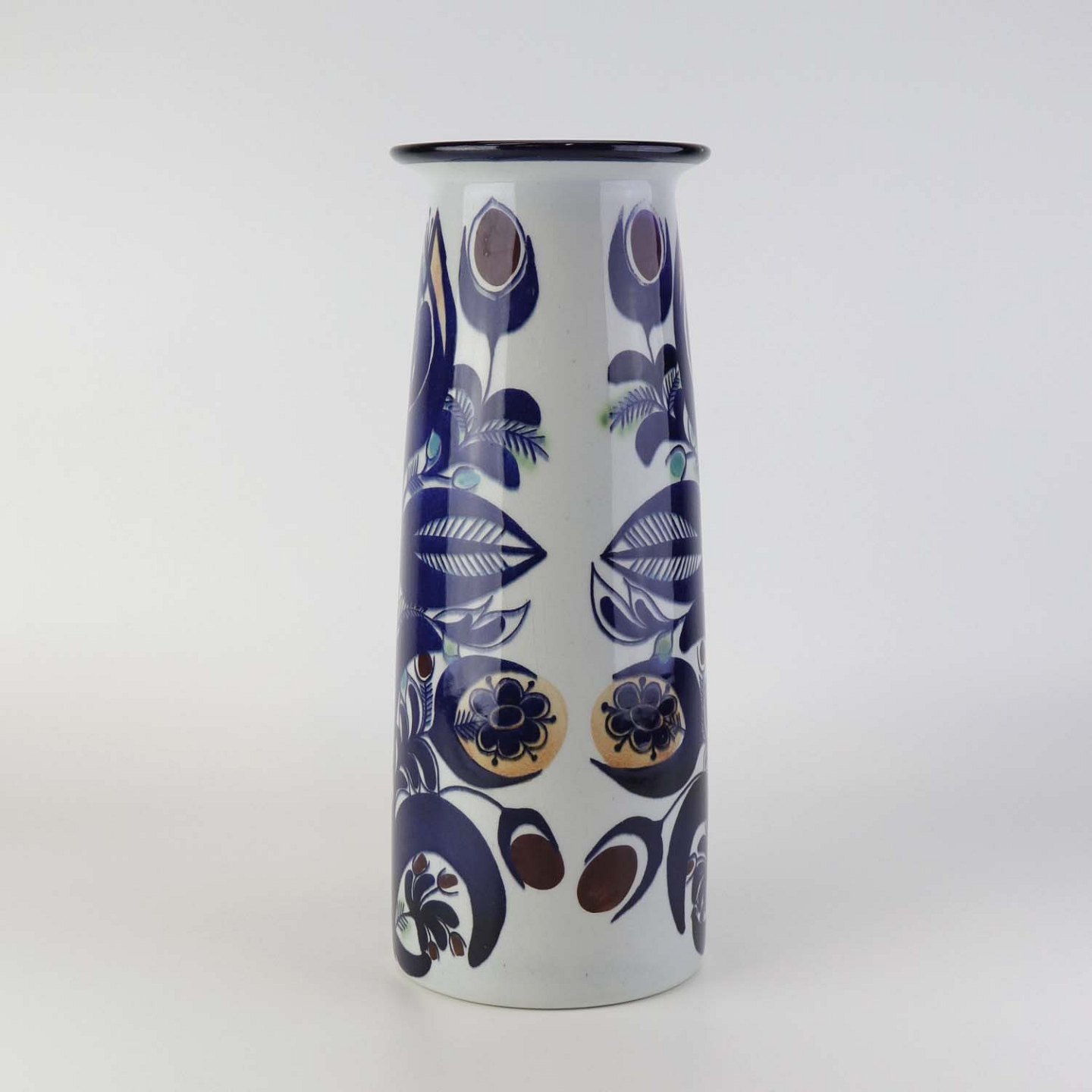 Vase i fajance fra Tenera serien med let krakkeleret glasur og blåt abstrakt blomstermønster. Nr. 207/2967Formgiver Berte Jessen