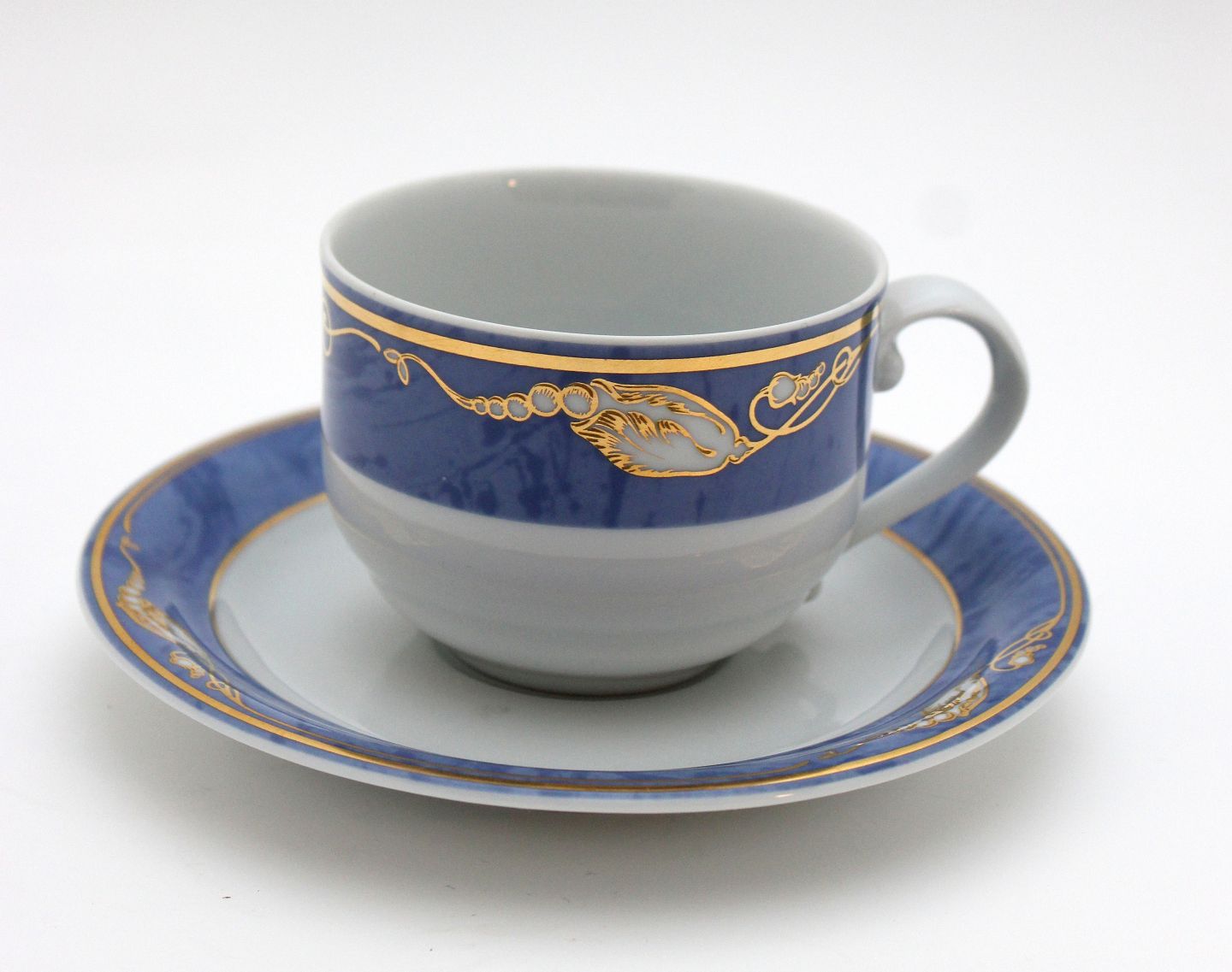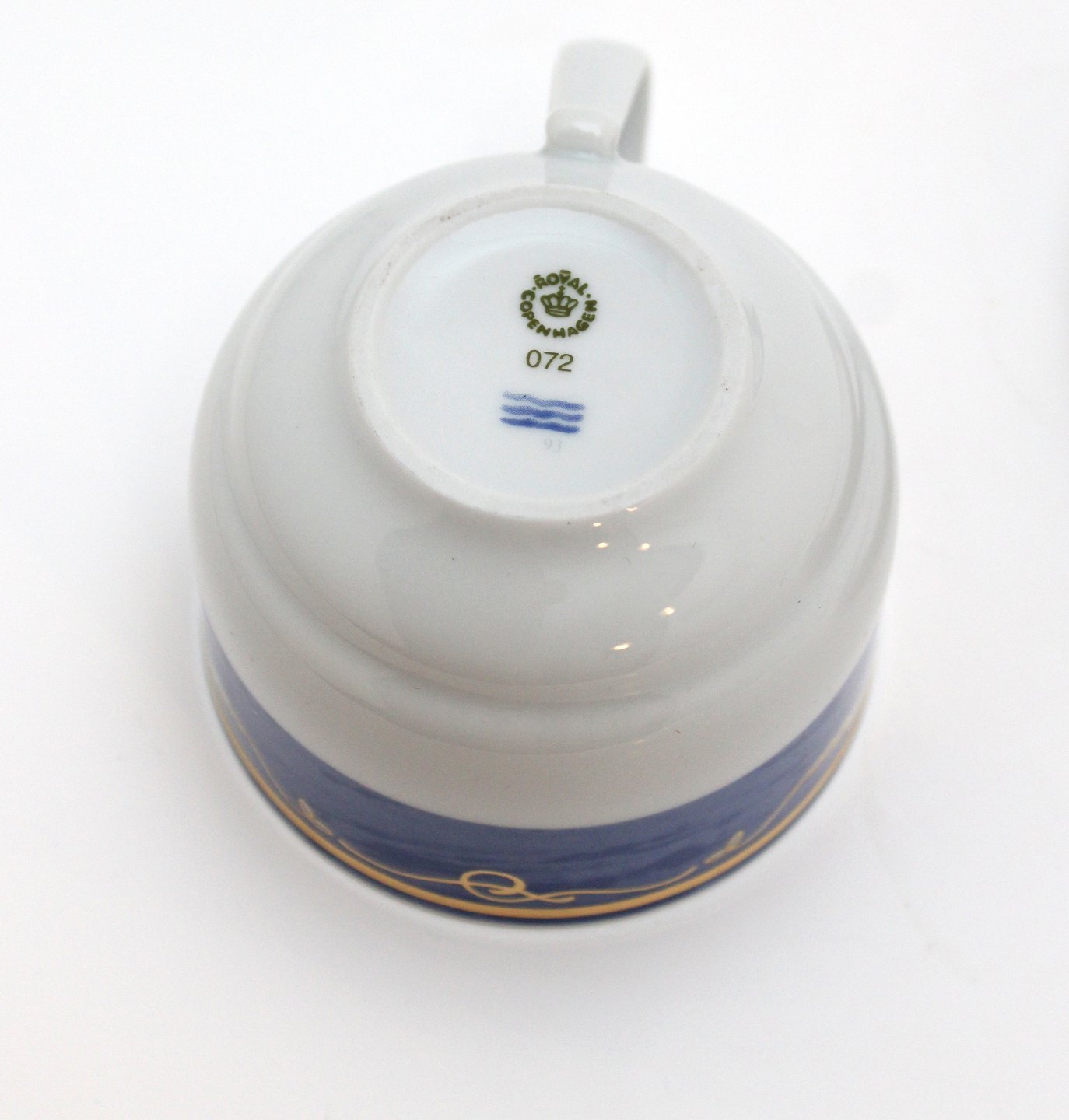 Royal Copenhagen, Blå magnolia. Blå marmoreret bort dekoreret med gylden blomsterknop. Designet af Flemming Eskildsen. Kaffekop nr. 072. Højde 6 cm. Diameter 8 cm. Underkop nr. 073. Diameter 14,5 cm. I. sortering. Flot stand. Pris: 125 kr. stk. Lager: 6