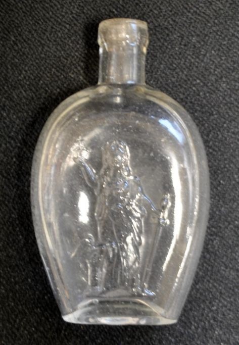 Deutsche Taschenlerche aus Klarglas mit Germania-Motiv, 19. Jahrhundert. Am Boden geprägt mit „1/8 L“. Länge: 12 cm.Bestellnummer: 28681