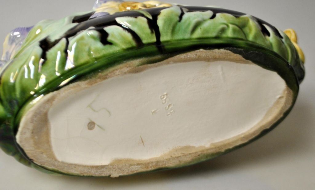 Majolika-Jardiniere, Deutschland, ca. 1900. Am Boden gestempelt: 5853. H: 12 cm. L: 27 cm.Einwandfreier Zustand!