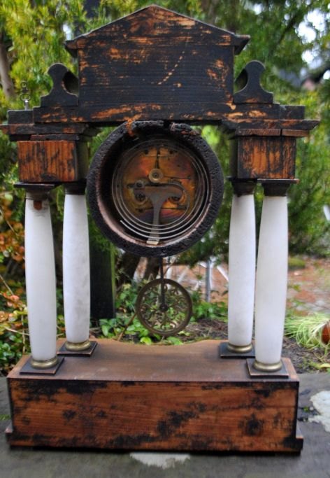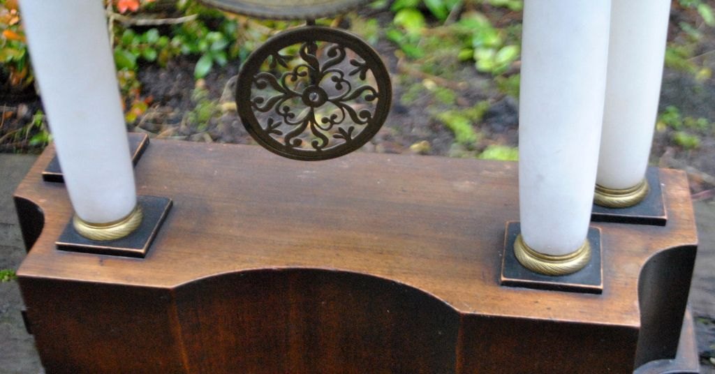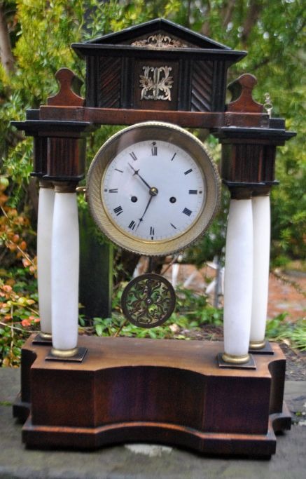 Säulenuhr aus Holz, Messing und Alabaster, um 1830. Vermutlich süddeutsch oder österreichisch. Sockel und Aufsatz aus Mahagoni. Emaille-Zifferblatt mit arabischen Ziffern. Standardwerk. Zeiger aus Bronze. Höhe: 45 cm. Breite: 32 cm.Mit zwei Aufziehschlüsseln.