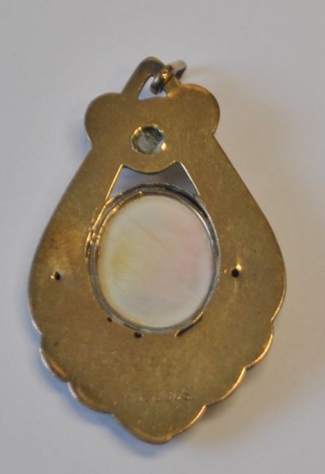 Holger Fischer (1893–1937), Kopenhagen, Dänemark: Vergoldete Brosche. Mit Perle und Kamee mit Diana im Profil. Gestempelt. Höhe: 5,5 cm.Bestellnummer: 28724