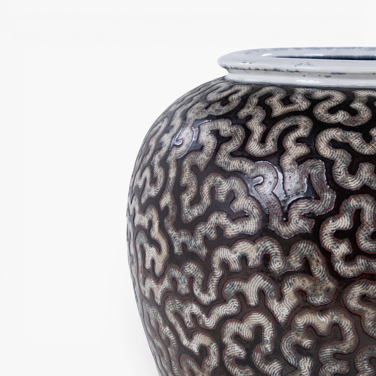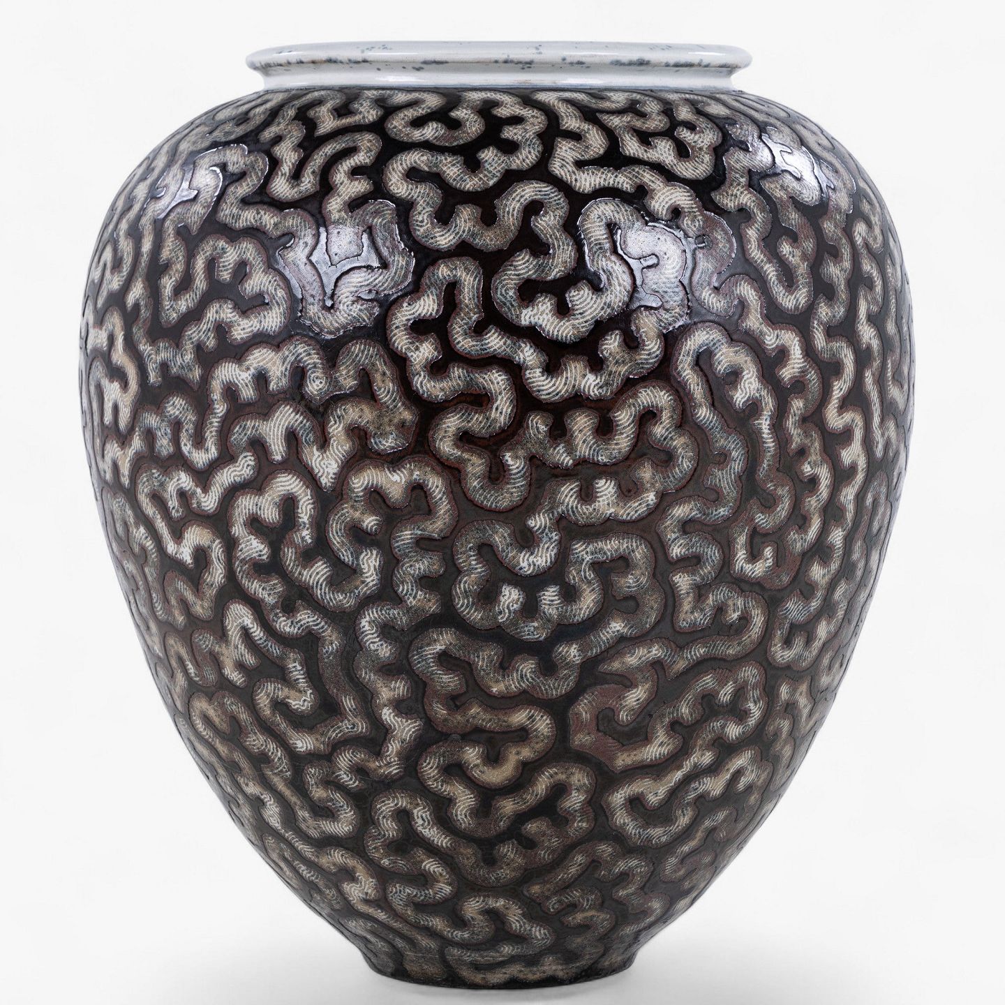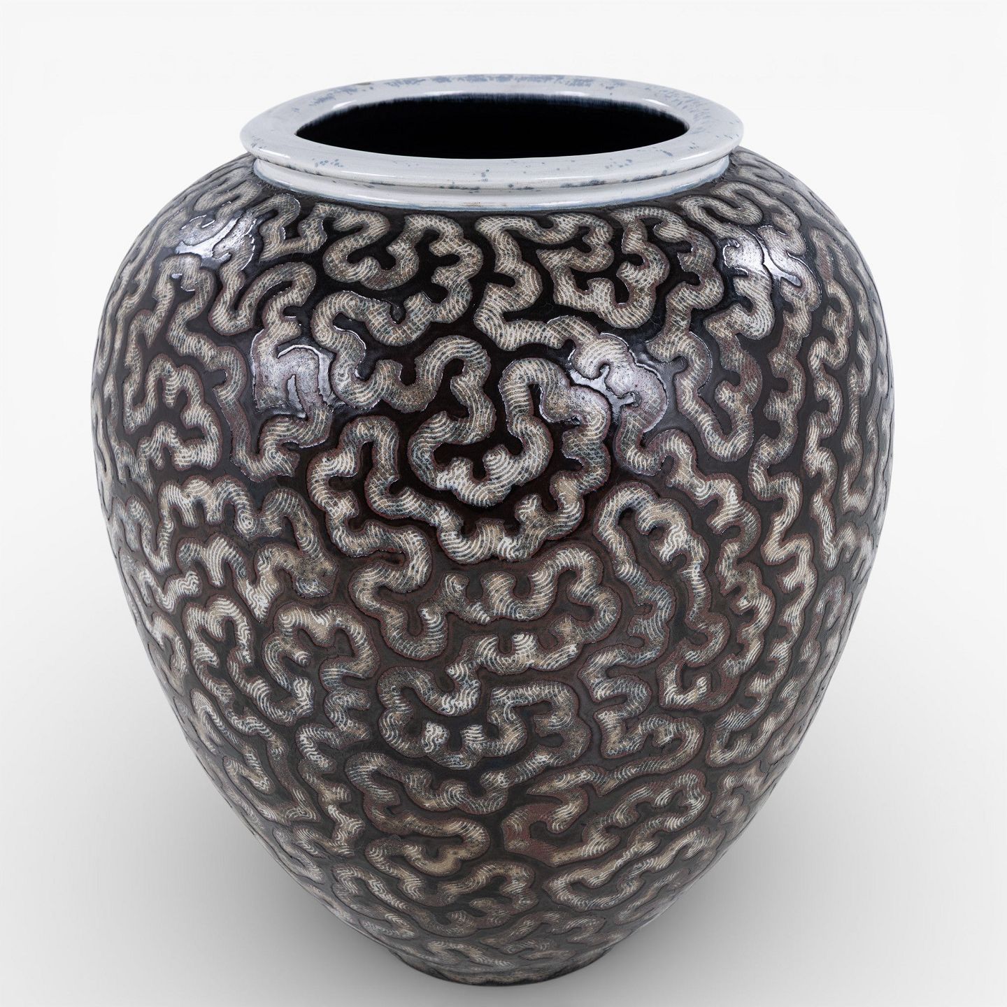 Per Weiss / Eget værksted.Kolossal krukke i stentøj med sort glasur og hvide stafferinger. Signeret.